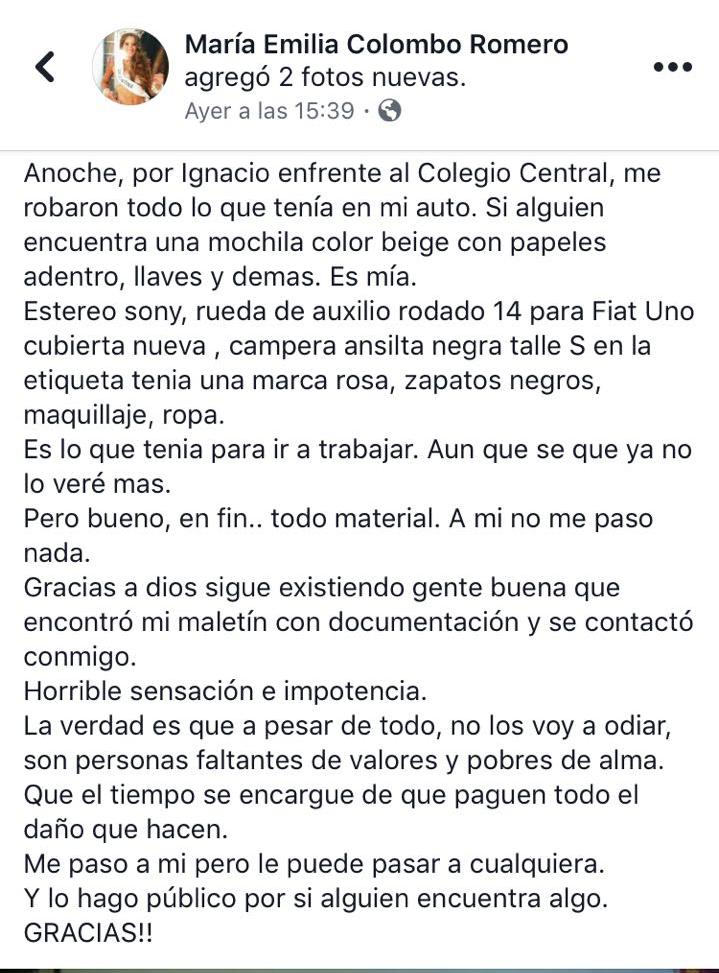 Afortunadamente, una persona le devolvió un maletín con documentación que encontró pero aún no recupera ropa, maquillaje, unos zapatos negros, una mochila beige, una campera negra Ansilta, un estéreo marca Sony y una rueda de auxilio rodado 14.