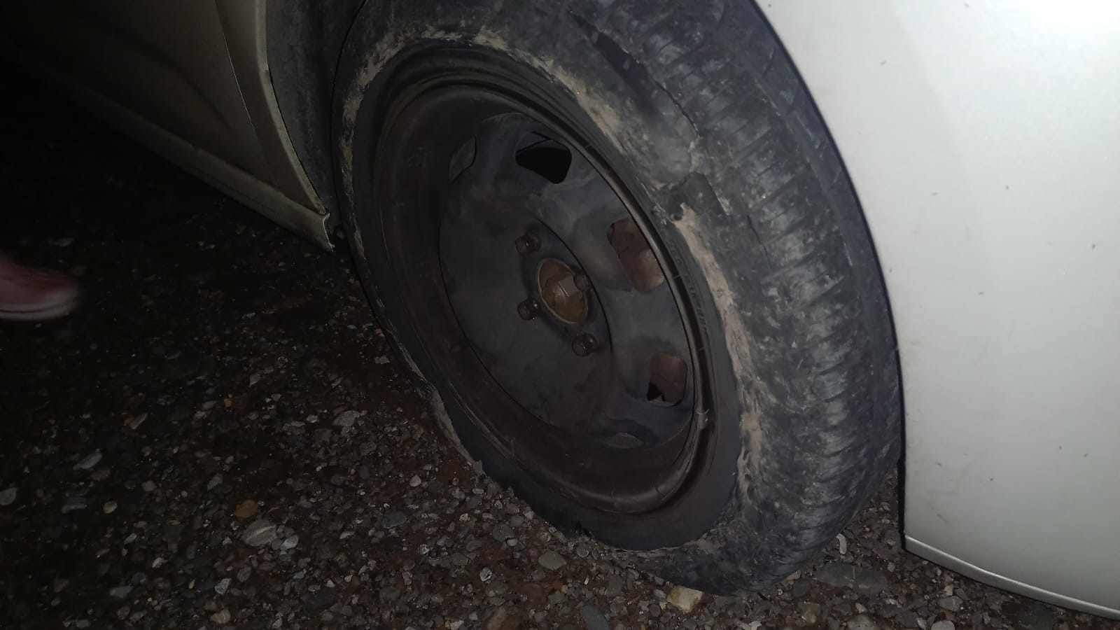 A los metros, el auto empezó a vibrar y el volante le tiraba hacia un lado. Tuvo que estacionarse en la banquina que estaba embarrada porque había estado lloviendo y con la luz de la linterna del celular pudieron cambiar el neumático. Afortunadamente, ellos no sufrieron lesiones pero rompieron una rueda y parte del paragolpes con el simbronazo.
