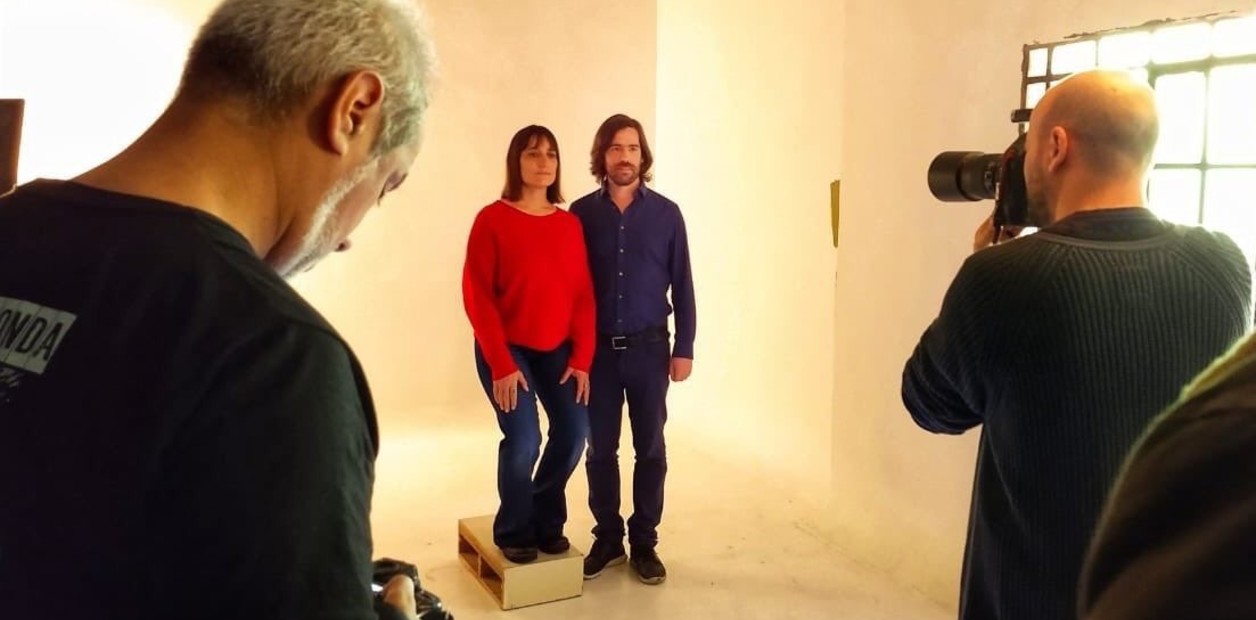 En la foto de cuerpo entero se puede ver a Del Plá parada sobre una tarima como las que se usan para nivelar la altura con una pareja en una foto, pero a la vez, la mujer flexiona las rodillas para agacharse.