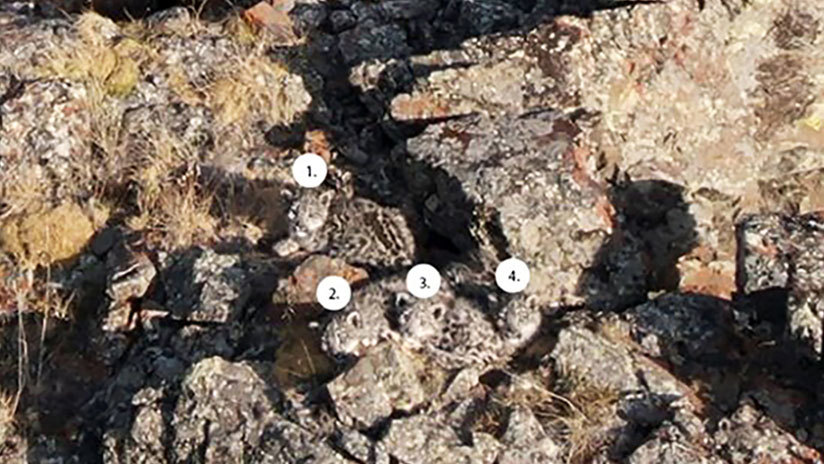 En la foto se puede apreciar a cuatro crías de leopardo de las nieves perfectamente camufladas pero para hacer esto es necesario prestar especial atención para distinguirlas de unas rocas cercanas. "La montaña donde vimos a las cuatro crías está a varios cientos de kilómetros de la frontera de Mongolia con Rusia", contó uno de los colaboradores.
