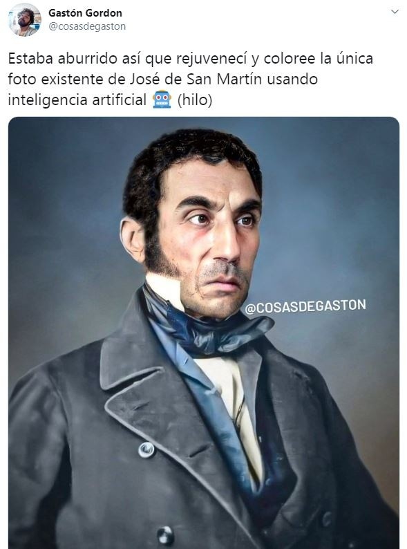 “Estaba aburrido así que rejuvenecí y coloree la única foto existente de José de San Martín usando inteligencia artificial”, indicó Gastón Gordon, en su cuenta de Twitter junto a una llamativa foto del prócer. El artista argentino, que ahora vive en Austria, se animó a “retocar” el mismísimo Padre de la Patria llegando a un resultado increíble.