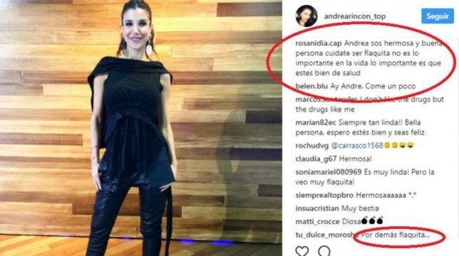 "Andrea sos hermosa y buena persona cuidate ser flaquita no es lo importante en la vida lo importante es que estés bien de salud", expresó uno de sus seguidores. "Ay Andre. Come un poco", comentó otro.