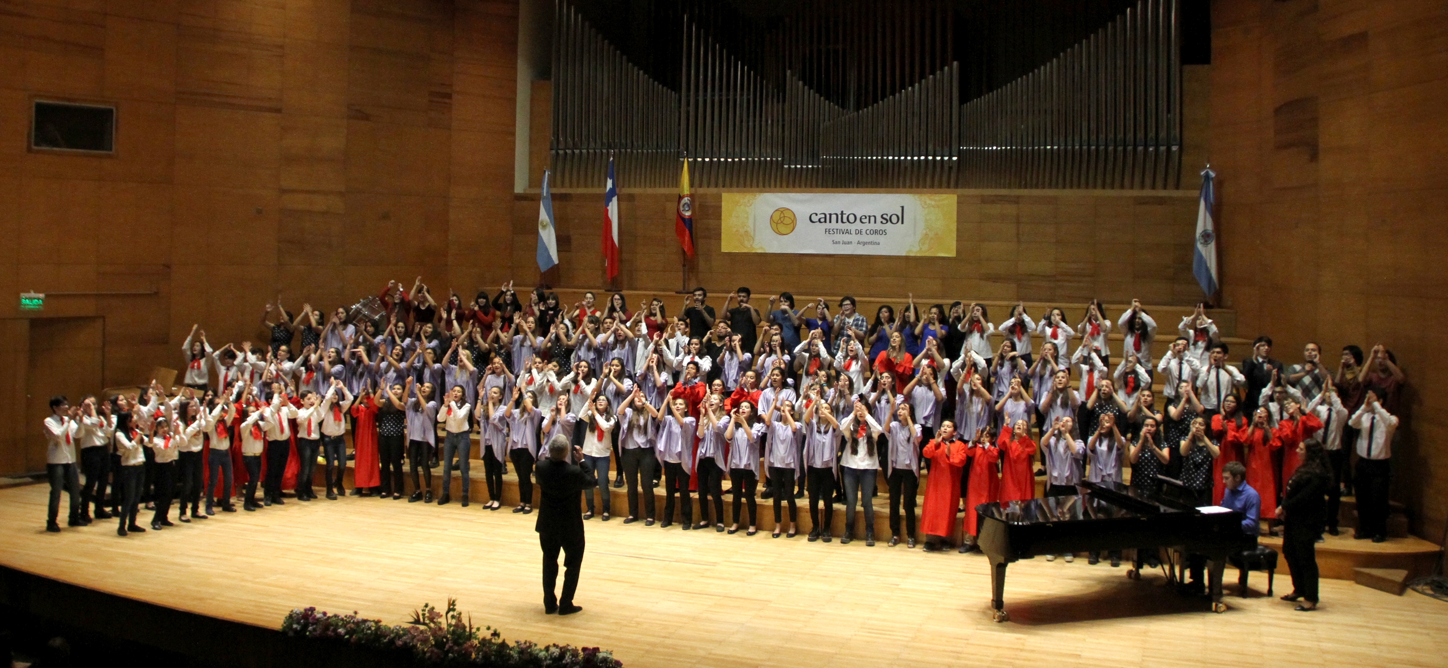 Terminó otra edición del festival Canto en Sol y el cierre fue una fiesta para participantes y público. El lunes por la noche en el Auditorio Juan Victoria, luego de las actuaciones individuales del Coro de la Escuela de Magisterio de Mendoza, el coro local Jorge Luis Borges, el Coro juvenil de Santa Luisa de Chile y el coro de NIños y Jóvenes de la UNSJ, vino la actuación de todos juntos. Durante el encuentro, las agrupaciones ensayaron junto al maestro Guillermo Pellicer -quien tuvo a su cargo los arreglos- dos obras para presentar en el final, donde también estuvo la directora Angela Burgoa. El resultado fue una fresca versión de Barbara Ann de Beach Boys, que junto a una pegadiza canción tradicional de Africa fueron el broche de oro para un festival dedicado a los niños y jóvenes coreutas, donde ellos fueron protagonistas y volvieron a demostrar que pueden ser grandes artistas.