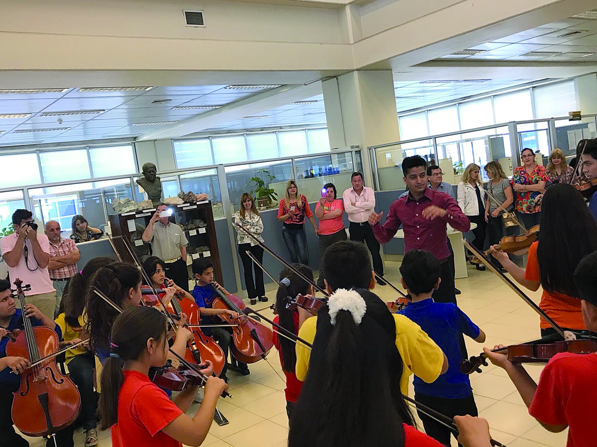 De pronto la Serenata Nocturna de Mozart se empezó a expandir por el quinto piso del Centro Cívico. Los empleados del Ministerio de Minería no entendían nada, sólo pudieron quedarse embelesados ante un grupo de chicos que hacían “hablar” a sus instrumentos de cuerdas con pasión. Los empleados no sabían que ese acto de entrega musical era simplemente gratitud. “Vinimos a traer un regalo al ministro”, dijo Jorge Rodrigo, presidente de la fundación “Orquesta Escuela de Sarmiento”, ante una secretaria que preguntó sorprendida. A partir de allí iniciaría un momento inolvidable que fue inundando de música cada uno de los pisos de las diferentes reparticiones del Centro Cívico.