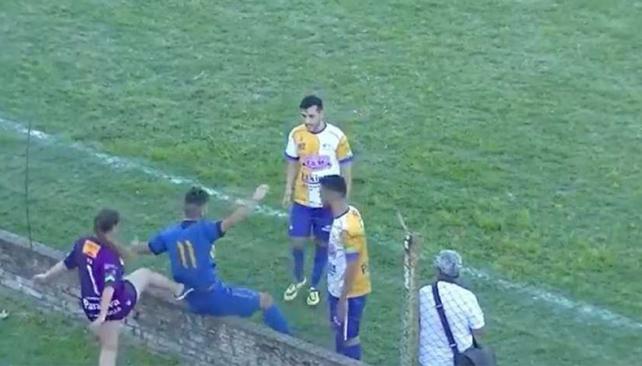En medio de los festejos, sobre el alambrado, una joven con los colores del buzo local no tuvo mejor idea que descargar su frustración por el resultado pegándole, desde afuera de la cancha y a través del alambrado, una patada a un rival.