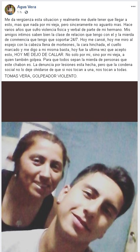 Agustina Vera es una joven de 20 años, quien denunció a su hermano Tomás Vera, de 18 años por violencia de género, tal como lo relató en las redes sociales y lo confirmaron en la comisaría de 25 de Mayo.