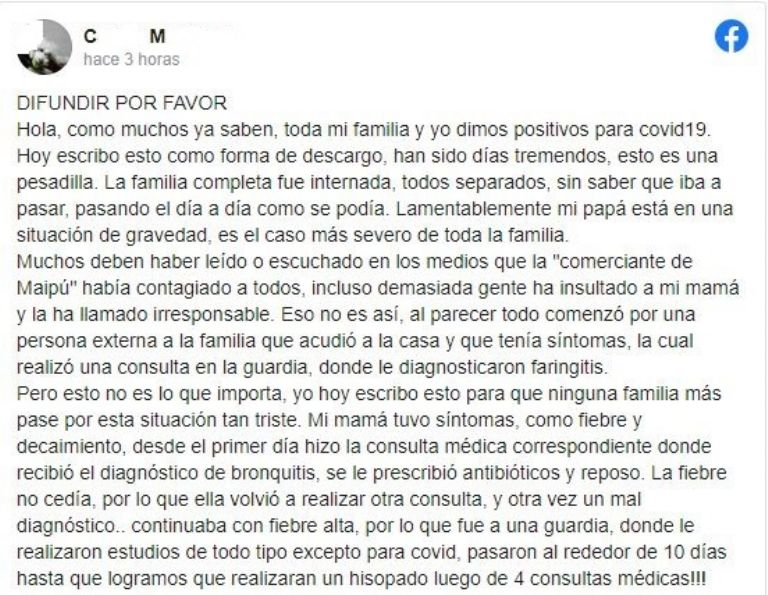 “DIFUNDIR POR FAVOR. Hola, como muchos ya saben, toda mi familia y yo dimos positivos para covid19. Hoy escribo esto como forma de descargo, han sido días tremendos, esto es una pesadilla. La familia completa fue internada, todos separados, sin saber que iba a pasar, pasando el día a día como se podía. Lamentablemente mi papá está en una situación de gravedad, es el caso más severo de toda la familia.Muchos deben haber leído o escuchado en los medios que la ‘comerciante de Maipú; había contagiado a todos, incluso demasiada gente ha insultado a mi mamá y la ha llamado irresponsable. Eso no es así, al parecer todo comenzó por una persona externa a la familia que acudió a la casa y que tenía síntomas, la cual realizó una consulta en la guardia, donde le diagnosticaron faringitis.Pero esto no es lo que importa, yo hoy escribo esto para que ninguna familia más pase por esta situación tan triste. Mi mamá tuvo síntomas, como fiebre y decaimiento, desde el primer día hizo la consulta médica correspondiente donde recibió el diagnóstico de bronquitis, se le prescribió antibióticos y reposo. La fiebre no cedía, por lo que ella volvió a realizar otra consulta, y otra vez un mal diagnóstico.. continuaba con fiebre alta, por lo que fue a una guardia, donde le realizaron estudios de todo tipo excepto para covid, pasaron al rededor de 10 días hasta que logramos que realizaran un hisopado luego de 4 consultas médicas!!! En todos esos días fue que empezamos a contagiarnos todos, en nuestra propia casa, habiendo respetado la cuarentena como debíamos. Si fuimos responsables, no nos dejamos estar. Fueron muchos malos diagnósticos. En mi caso particular comencé con febrícula y dolores musculares, inmediatamente realicé una consulta y cual fue mi diagnóstico? FARINGITIS!!! Yo puse en riesgo la vida de mi pareja, de su familia y la de mis compañeros de trabajo por otro mal diagnóstico. Esto no es para que caigan los médicos ni nadie, es para que llegue al señor gobernador, al ministerio o a quien tenga que llegar, para que cambie el sistema y a penas se presente un síntoma se haga el estudio correspondiente. De esa manera, se podrían haber evitado muchísimos contagios y quizás hoy mi papá estaría bien.Y les pido por favor, no discriminen a la gente contagiada, se sufre mucho y a cualquiera le puede tocar. Muchas gracias”.