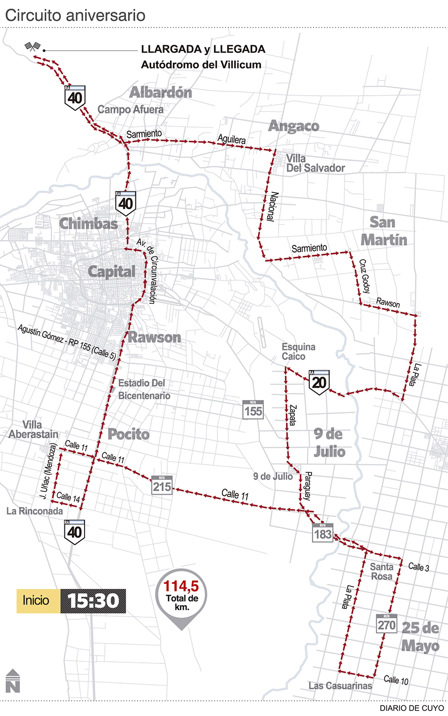 Tras salir a las 15.30 de la pista albardonera, se viajará hasta Angaco, luego se pasará por San Martín, Caucete, 9 de Julio, 25 de Mayo, Pocito, Rawson, Capital y Chimbas, para concluir con cinco giros en el autódromo que ha sido durante esta temporada a "casa del ciclismo".