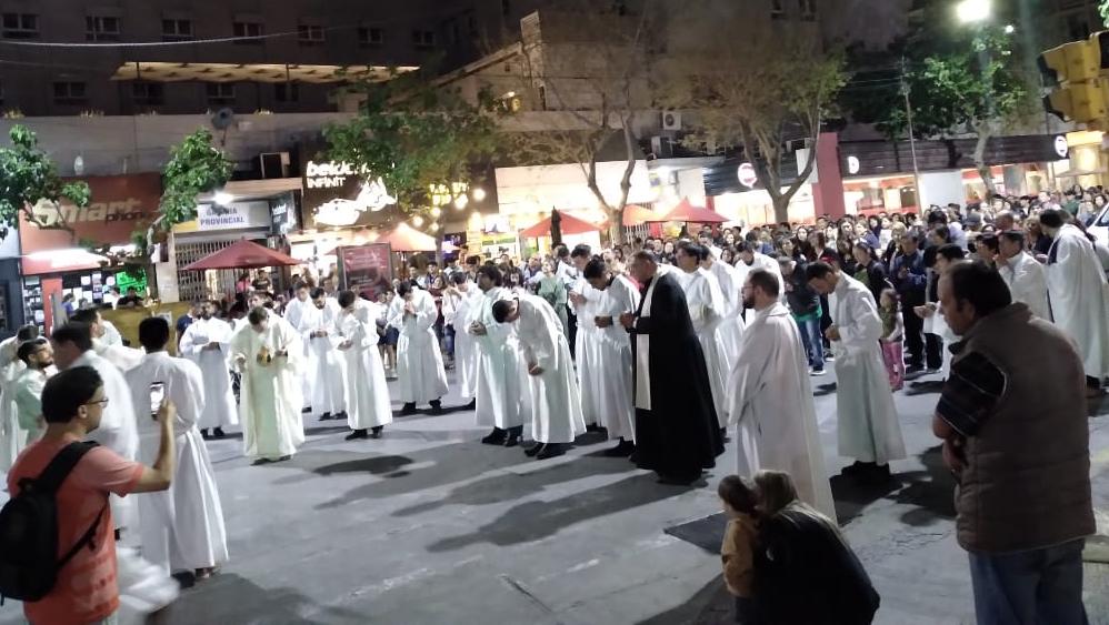 Los fieles junto a todo el grupo sacerdotal dieron una vuelta a Plaza 25 pero en cada estación aprovecharon para rezar, siempre teniendo a los jóvenes en el eje de la escena. Se vivieron momentos de profunda emoción debido a la situación de público conocimiento y que conmociona a la provincia.