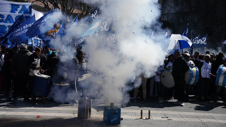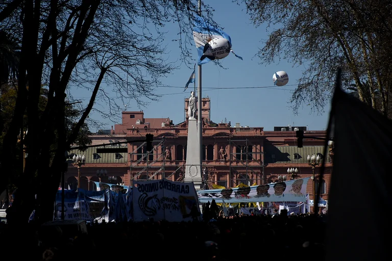 Con banderas, bombos, pancartas y trompetas, se espera una multitudinaria manifestación en frente de la Casa Rosada. El tránsito está totalmente cortado en ambos sentidos de la Avenida 9 de Julio desde el Obelisco hasta avenida San Juan.