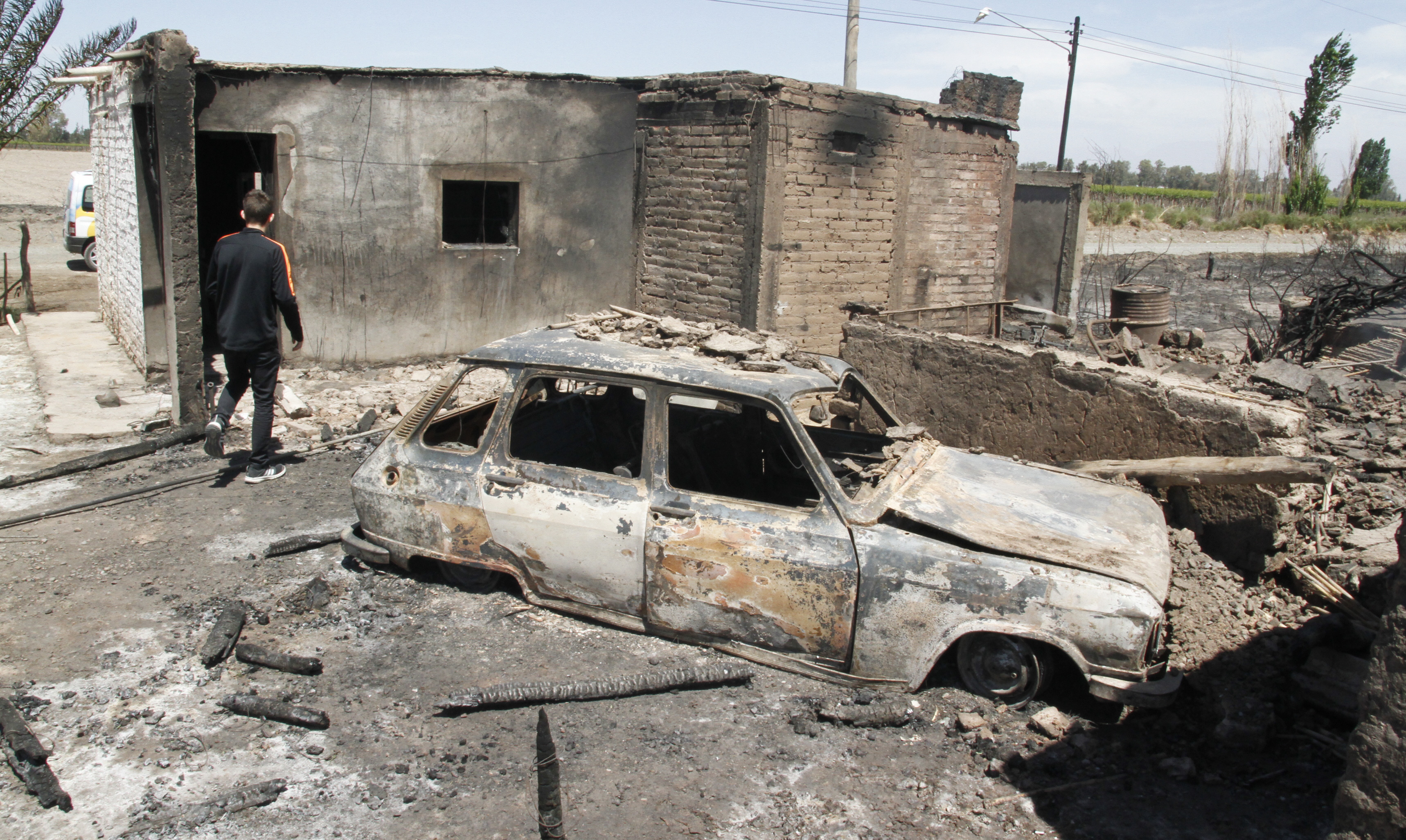 Carlos Roldán y su familia alcanzaron a sacar algo de la casa para que no la alcanzaran las llamas, pero la fuerza del viento Zonda resultó imparable y al final lo tuvieron que lamentar: sobre las 16 del lunes, el hombre, su familia (esposa y tres pequeños hijos) y sus vecinos tuvieron que mirar con impotencia cómo el fuego arrasaba con todo en la vivienda de la finca donde trabaja y es casero (calle Malvinas, unos 200 metros al Este de Mitre, en San Martín). Las llamas destruyeron incluso el Renault 6 que tres semanas atrás pudo comprar luego de grandes esfuerzos para ahorrar.