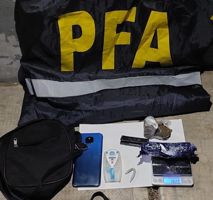 Los uniformados procedieron a entrevistarlos y realizó una requisa en sus pertenencias. En ese contexto, hallaron en el interior de un bolso de mano que llevaba la mujer, un objeto de forma cilíndrica recubierto con un preservativo, que contenía 102,2 gramos de cocaína. Además llevaba un cigarrillo de armado casero de marihuana y un envoltorio con 40 gramos de marihuana en su interior.