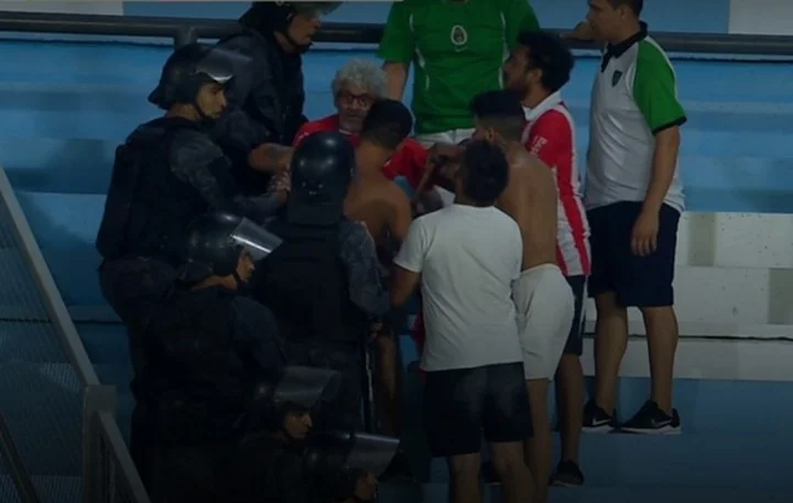 En un sector de la cancha, donde parcialidades de ambos equipos se encontraban separadas apenas por una reja y sin custodia policial, comenzaron a intercambiar insultos y a arrojar objetos. Tuvo que intervenir personal de seguridad. El encuentro estuvo demorado por unos minutos y se reanudó una vez que la situación estuvo controlada.