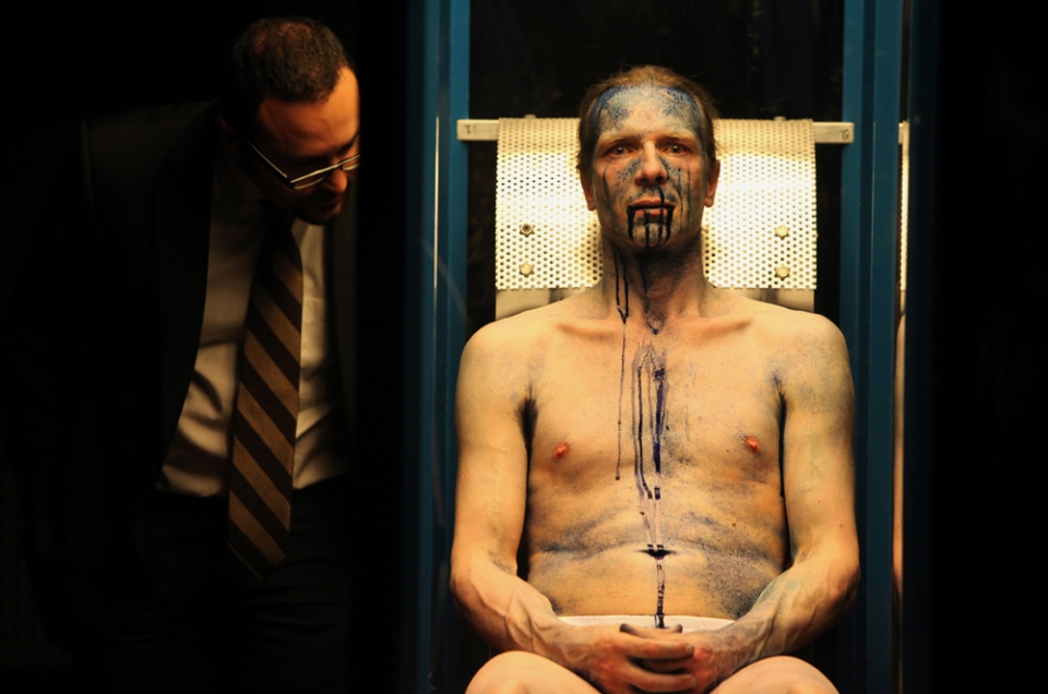 Arte vivo. El performer en la cabina, o "jaula" donde se produce el fenómeno que ya recorrió una treintena de países en Europa, América y Asia.