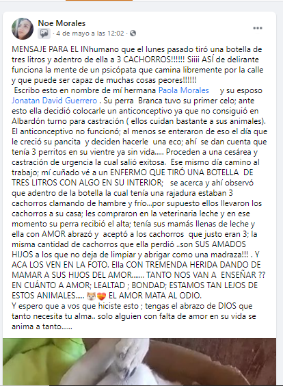 En un grupo de proteccionistas, una integrante repudió a un hombre que tiró a tres cachorros recién nacidos en una botella. Según la historia, su hermana y cuñado vieron cómo el sujeto tiraba a los animales pero no pudieron detenerlo.