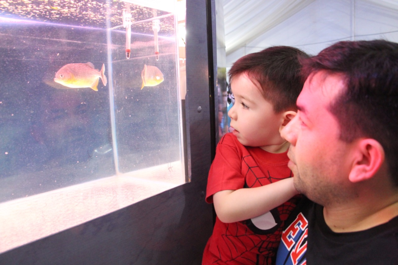 La piraña carnívora se luce en soledad en un cubículo superior, debajo hay otra pecera en la que se puede ver varias pirañas del tipo melisoma, que son herbívoras, dato que también sorprende a los observadores debido a que la mayoría desconoce la existencia de "pirañas vegetarianas".