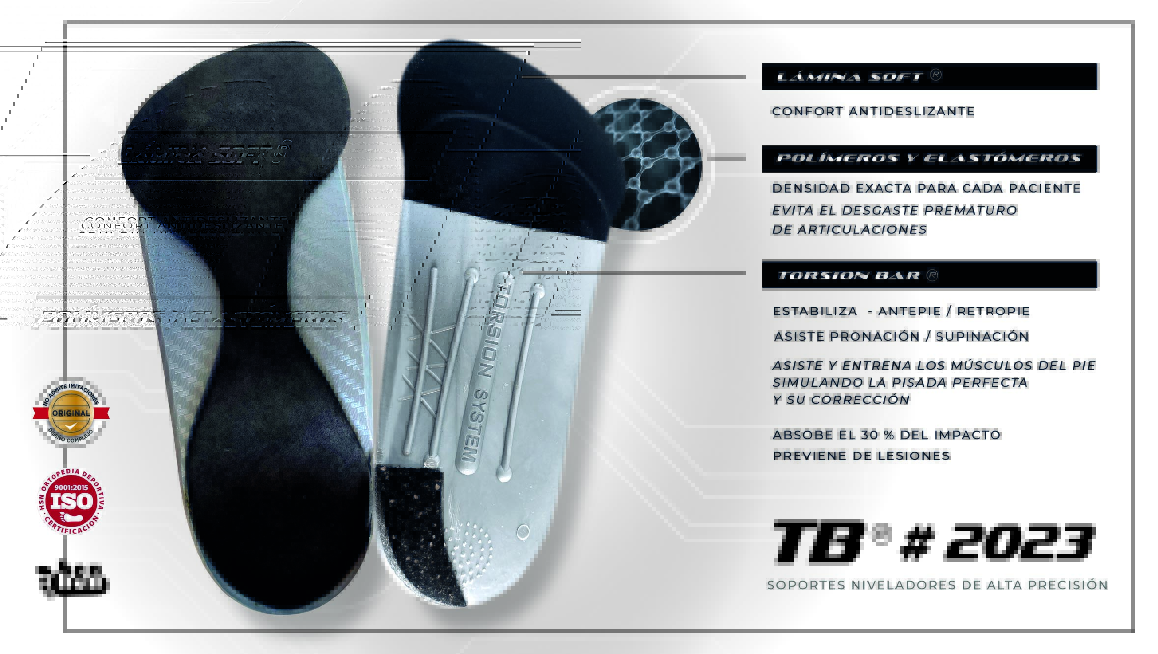 Esto hace que la densidad y la flexibilidad del material sea muy exacta para amortiguar absorber el 30% del peso y evitar las lesiones y los dejaste prematuro en las articulaciones. Lo nuevo sería la nueva densidad y también una lámina Soft, que lleva un material de absorción de impacto y antideslizamiento que le dan más confort a la plantilla y protege los metatarsos. Además, se le suma una barra torsión bar, esto es para la estabilización delante pie y el retropié y el software nuevo permite aparte de poder evaluar la postura en la pisada estática y dinámica también permite evaluar la postura del cuerpo en general completamente.