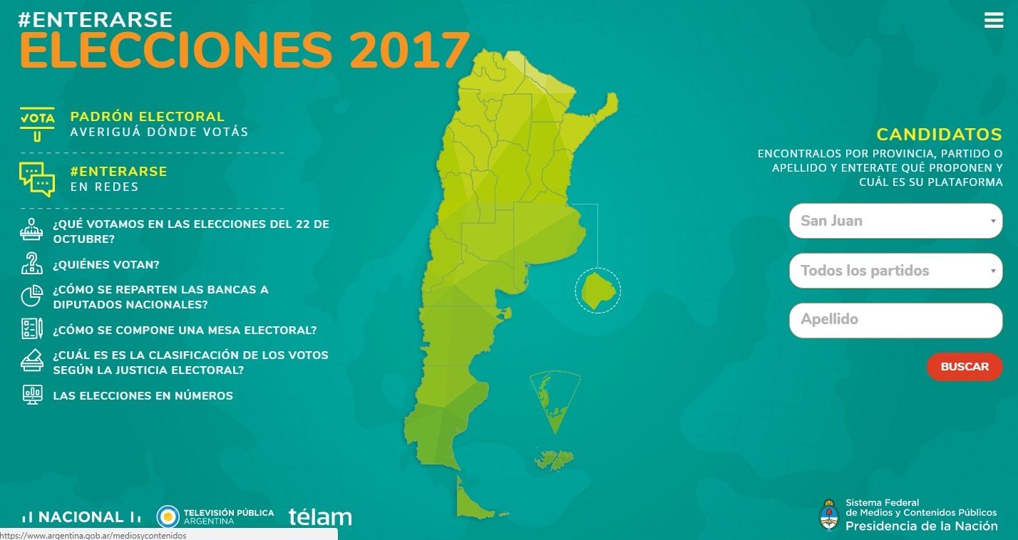 #Enterarse fue realizada por Radio Nacional, Televisión Pública Argentina y la agencia nacional de noticias Télam. Tiene información sobre todos los partidos políticos que compiten en estas elecciones en cada una de las provincias.