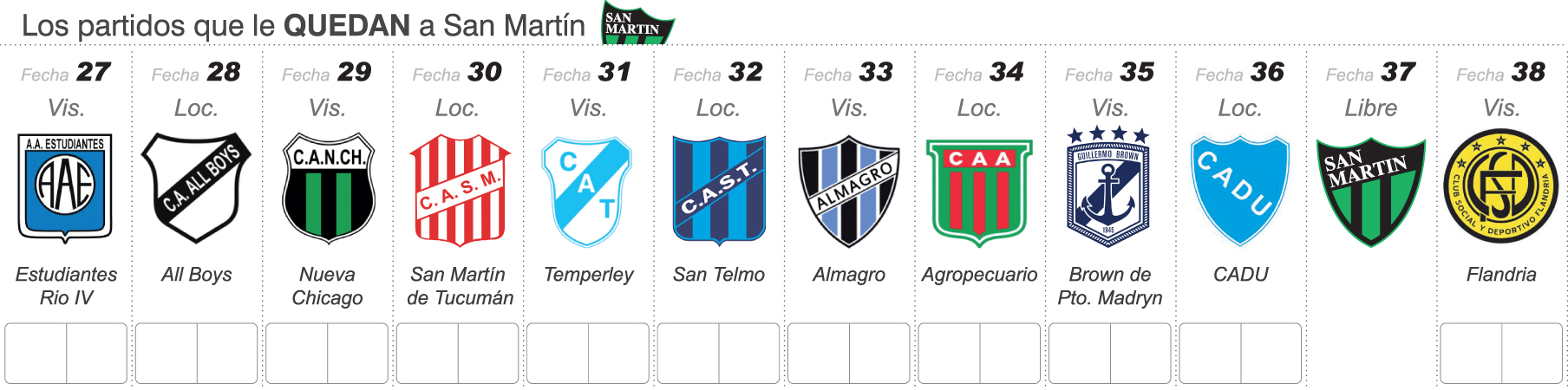 Repasando la campaña como local, que con la caída ante Defensores de Belgrano se cortó una racha de 11 juegos sin derrotas en el Hilario Sánchez, San Martín tendrá que potenciar su localía para pelear las posiciones de arriba. Tener a Agropecuario, San Martín de Tucumán y el CADU en Concepción serán esas chances que no se pueden dejar pasar para terminar consolidando sus aspiraciones. después, San Telmo y All Boys, metidos en la pelea por la Permanencia, tendrían que entrar en el terreno de los partidos que se deben ganar si o si en San Juan. De visitante y viendo que a San Martín se le ha complicado esta faceta perdiendo partidos que parecían controlados, el repaso de lo que se viene tiene sus cuidados. Este sábado, en Río Cuarto, el recuperado Estudiantes de Iván Delfino promete ser más que duro. Luego será el momento de ir a Mataderos y cruzarse con Nueva Chicago que levantó, se metió en zona de Reducido y no dejará pasar su chance como local. Luego llegará la visita a Temperley sabiendo que el Celeste está en el límite para ingresar a pelear por algo y tampoco será anfitrión muy amigable. La salida siguiente será a José Ingenieros para jugar contra el urgido Almagro que necesita puntos para sostener la categoría pero que aspira también a la pelea por algo más en esta temporada. La penúltima salida será a Puerto Madryn para jugar con Guillermo Brown, un rival que se cayó en la tabla y que a esa altura, fecha 35, tendrá que buscar puntos para sostener la categoría como sea. Luego, en la fecha 37, San Martín verá la definición desde afuera, sabiendo que en la última salida irá a Flandria con la opción que el Canario ya esté descendido si continúa su campaña como hasta ahora. En concreto, a San Martín le quedan por disputar 33 puntos. 18 afuera de San Juan y 15 en el Pueblo Viejo. Sus números solo cierran si puede recuperar el poderío de local y la regularidad como visitante para sumar siempre. Otra receta no hay. San Martín ostenta un registro de tenencia de pelota que es envidia para el resto de la divisional, pero sin goles, todo es estéril.