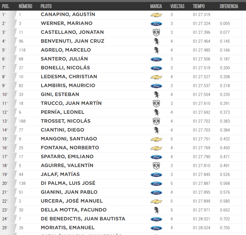 Canapino, vigente campeón, con un tiempo de 1m27s319, alcanzó su segunda prueba consecutiva de clasificación en lo más alto (había sido el poleman de Buenos Aires). El arrecifeño le sacó, apenas, 5 milésimas a su inmediato perseguidor: Mariano Werner.