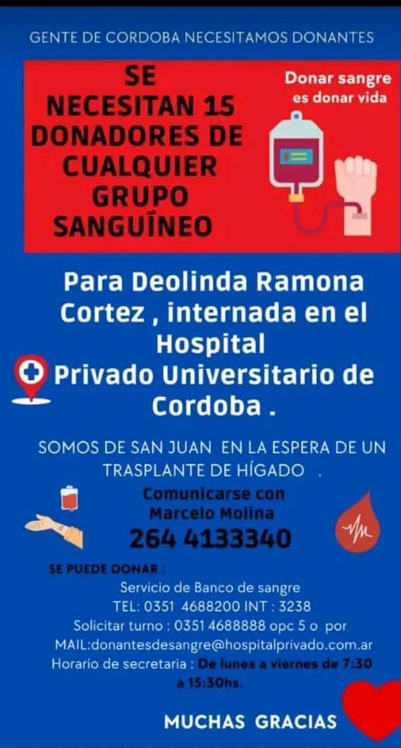 Una familia sanjuanina encabeza una campaña en redes sociales que busca hacerse eco en sanjuaninos residentes en Córdoba. Es que Deolina Ramona Cortéz, una ama de casa de 36 años y oriunda de Rawson, se encuentra internada hace un mes a la espera de un doble trasplante, de hígado y riñón, y para poder acceder a los órganos requieren de 15 a 20 dadores de sangre, de cualquier factor.