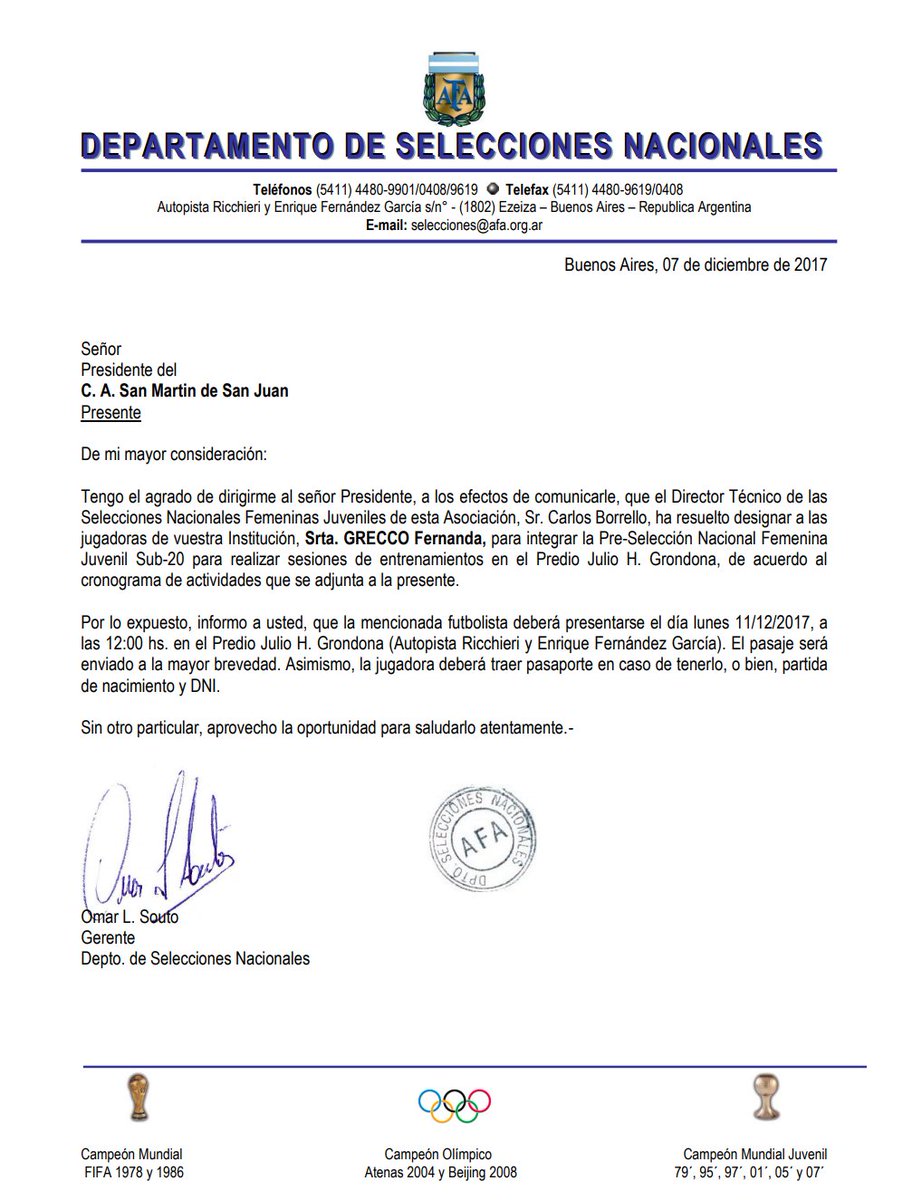 El Departamento de Selecciones de la Asociación del Fútbol Argentino envió una nota convocando a Fernanda Grecco a que se presente el próximo lunes a los entrenamientos que tendrán lugar en el predio de Ezeiza.