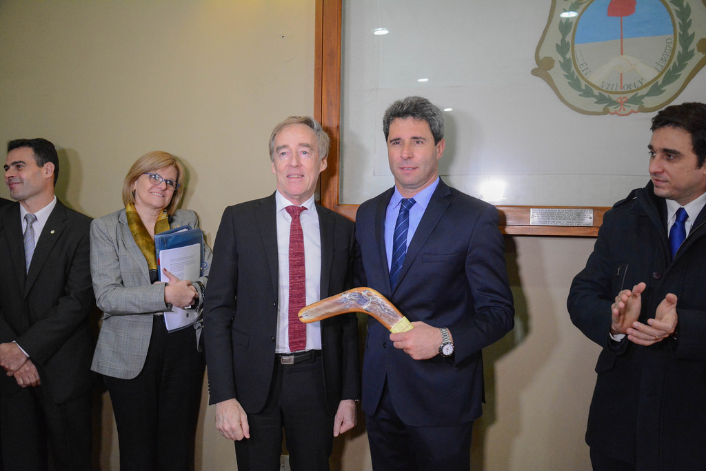 Por su parte, Campbell "es una relación que tiene mucho potencial". Luego, llegó el momento del intercambio de presentes y allí el asutraliano le entregó a Uñac un boomerang "como este elemento, que va y viene, espero que usted vaya a Australiua en un futuro".
