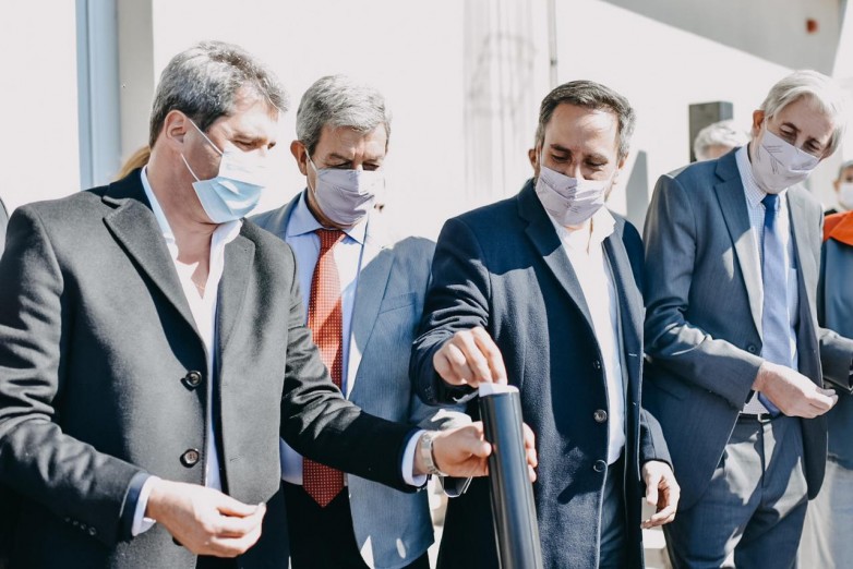 En su visita a San Juan, el ministro de Ambiente y Desarrollo Sostenible de la Nación, Juan Cabandié, acompañó al gobernador Sergio Uñac en la colocación de la piedra basal para la futura construcción de la fábrica de paneles solares del EPSE.