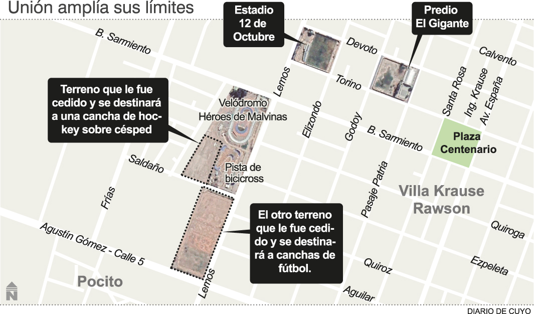 Los predios fueron cedidos al club en el año 2019 pero el trámite legal terminó por darse en estos últimos meses y fue allí donde el club comenzó con la puesta a punto de los mismos (ver infografía). Uno de los terrenos ahora en manos de Unión, está ubicado detrás de la pista de bicicross del Polideportivo Municipal de Rawson, en donde también está emplazado el velódromo "Héroes de Malvinas". Ese sector, ubicado en calle Lemos y Emanuel Saldaño tiene 90 metros de ancho y 120 metros de largo y la intención allí es hacer una cancha de césped sintético que sirva para que los clubes de hockey sobre césped puedan practicar allí. En el departamento hay 5 ó 6 clubes fuertes en esta disciplina, pero no cuentan con un sintético”, comentó hace unos días a DIARIO DE CUYO, Daniel Peña, presidente del Azul.