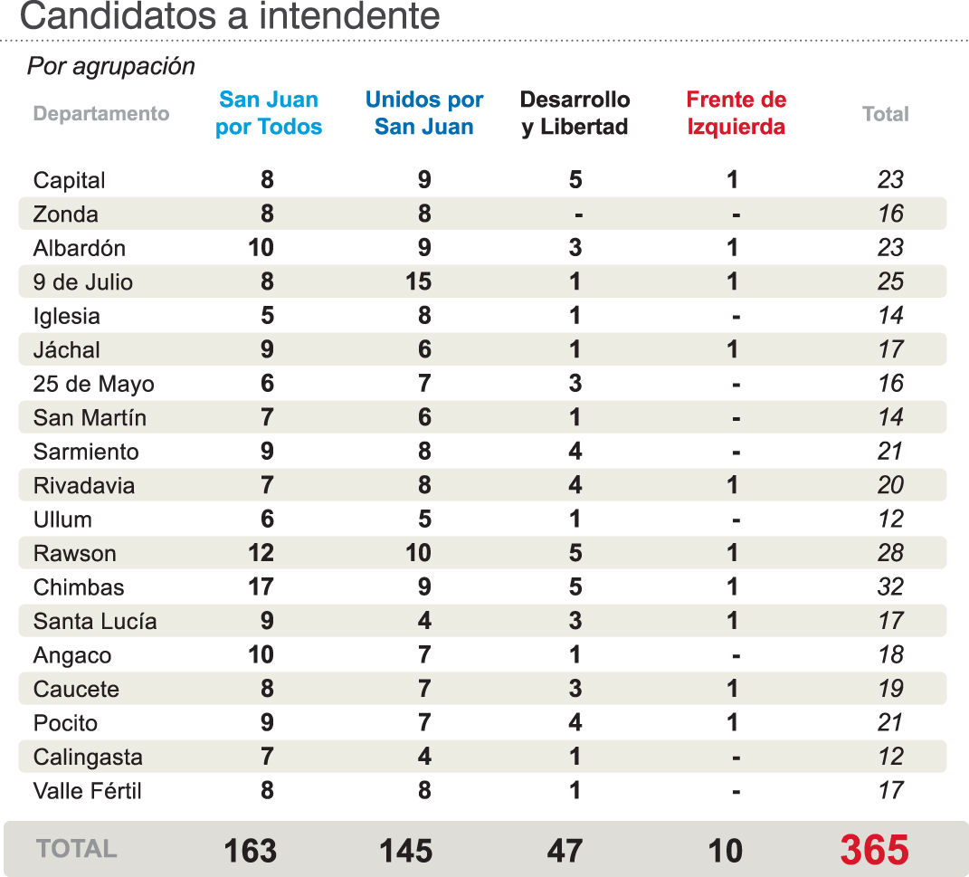 Una muestra de la magnitud se refleja en las candidaturas a intendente, de las que se desprenden sus respectivos postulantes a los concejos deliberantes, que son los que mayor incidencia tienen en el número global. Para esta elección, hay 365 listas para las 19 jefaturas departamentales, es decir, 365 aspirantes entre los cuatro frentes. El relevamiento saca a la luz que Chimbas y Rawson son los que tienen más pretendientes, con 32 y 28 respectivamente (ver infografía).
