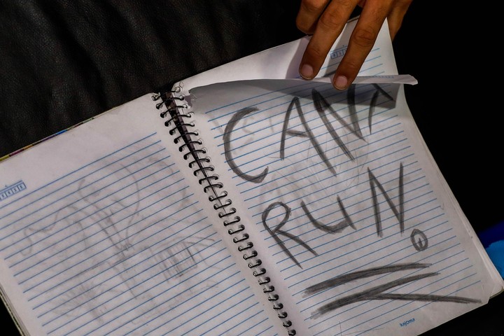 Fotografía de un cuaderno en el que se lee en inglés "No puedes correr", encontrado en el auto de los atacantes.