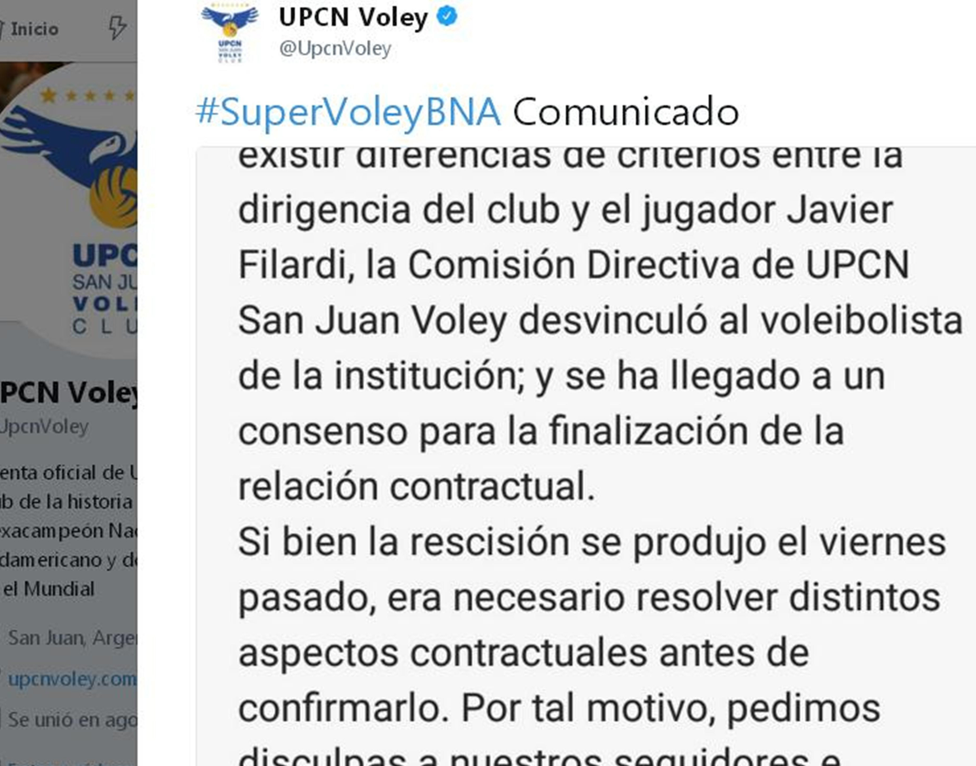 A su vez, también se refirió indirectamente a Nikolay Uchikov, el opuesto búlgaro que fue desvinculado del club y quien había acusado a Filardi de haber sido responsable de su salida. “Los problemas de UPCN son por culpa de Filardi, es mala persona”, había expresado por entonces el europeo. “Los que se fueron será porque no se entregaron al equipo y esas decisiones la toma dirigencia y cuerpo técnico”, refirió el cordobés en su comunicado.