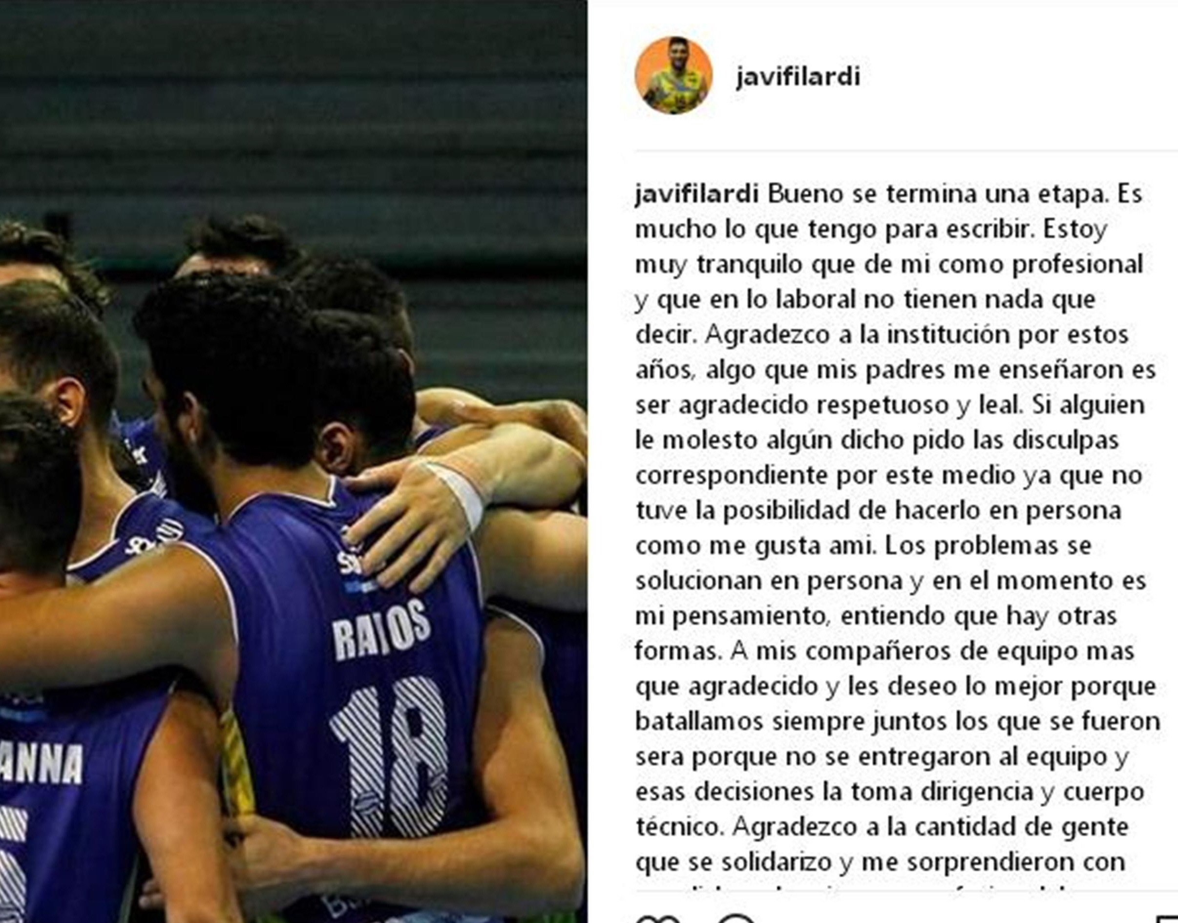 Por su parte, Javier Filardi (quien volvió a su Córdoba natal) también usó sus redes para explicar lo sucedido. “Estoy muy tranquilo que de mí como profesional y en lo laboral no tienen nada que decir. Agradezco a la institución por estos años; algo que mis padres me enseñaron es ser agradecido respetuoso y leal. Si a alguien le molestó algún dicho pido las disculpas correspondiente por este medio, ya que no tuve la posibilidad de hacerlo en persona como me gusta a mí”, comenzó afirmando el jugador, que con UPCN ganó tres Ligas Argentinas y dos Campeonatos Sudamericanos.