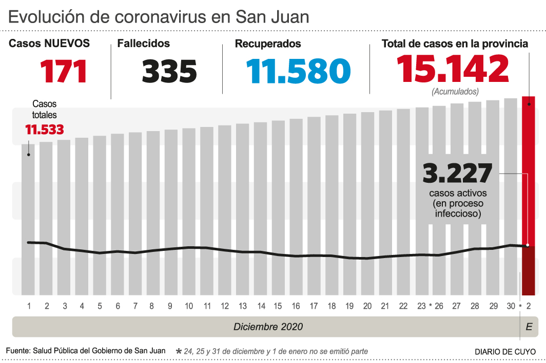 Entre el 31 de diciembre y los dos primeros días del año, Salud Pública indicó que fallecieron ocho personas. Se trata de seis hombres de 79; 49; 83; 49; 57 y 82 años y dos mujeres de 80 y 72, por lo que el total de muertes por Covid asciende a 335. A su vez, hubo 171 nuevas confirmaciones y el nuevo año ya tiene un acumulado de 15.142 casos. Entre ellos hay 3.227 con infección en curso y 81 pacientes internados en área crítica.
