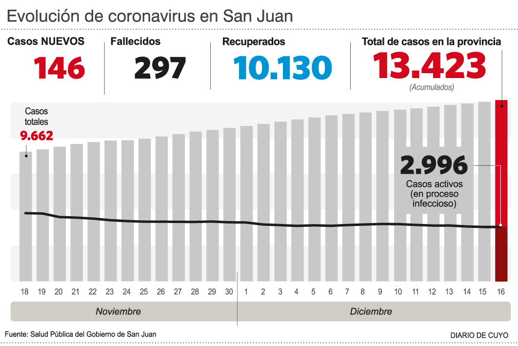 Dos mujeres, una de 91 y otra de 92 años, ambas vecinas de Capital, fueron los decesos informados ayer. De esta manera, la provincia suma 297 fallecidos por Covid. Por otro lado, hubo un salto en el promedio de casos diarios pues ayer reportaron 146, para un acumulado de 13.423 contagios desde el inicio de la pandemia. De ellos hay 2.996 personas con infección en curso.