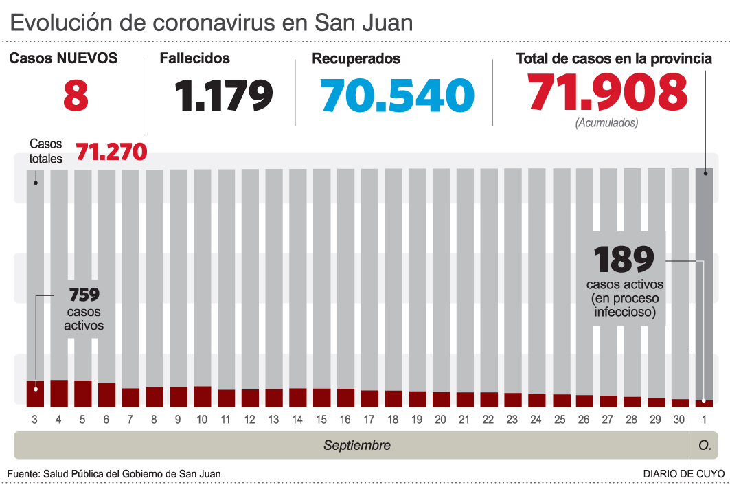 Los 8 positivos fueron confirmados luego de 480 test, por lo tanto se trata de sólo el 0,01% de positividad en toda la provincia. De esta manera, la curva de contagios sigue con su tendencia a la baja y tras un mes como septiembre que tuvo una contracción del 84% con respecto a la cantidad de casos en agosto, octubre tuvo un inicio favorable.