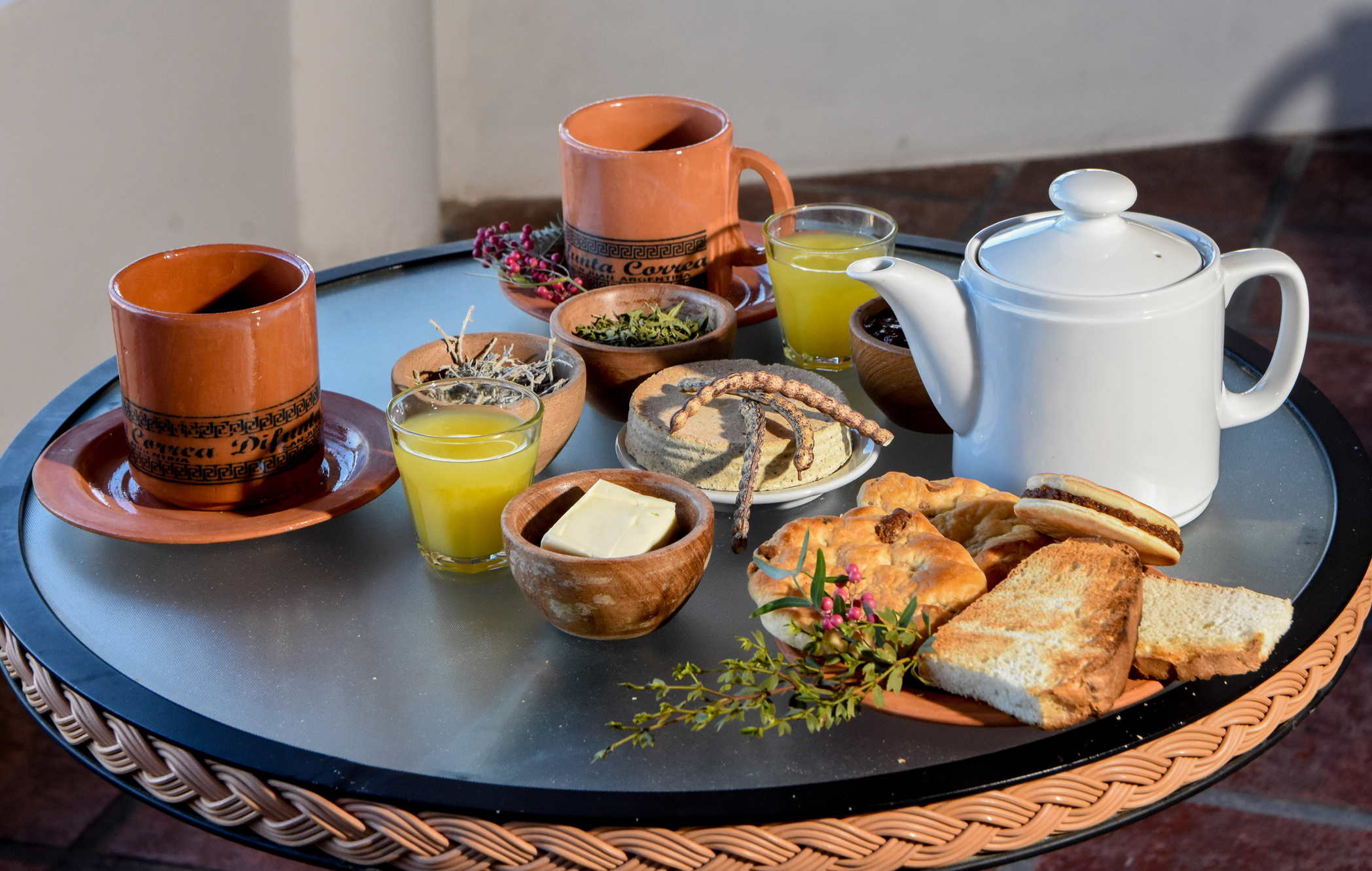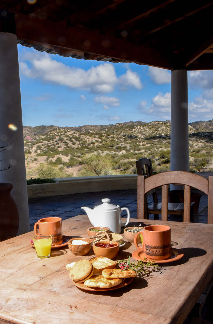 Lo que sí se ha incorporado en el hotel y es quizás el mayor atractivo por estos días, es un suculento y tentador desayuno campestre servido en vajilla terracota con el logo de la Difunta Correa. La novedad es que en vez de los alimentos comunes e industrializados que solían servirse, ahora hay tostadas de pan casero, medialunas y semitas con chicharrones y una de las estrellas de esta primera comida del día, las típicas tabletas rellenas con dulce de membrillo o arrope de uva, acompañada por manteca y dulces de estación (por estos días ofrecen dulce de uva y de tomate casero). Para beber, además del vasito de jugo de naranjas exprimido, se puede optar por leche, café y té. Justamente en esta última opción, han incorporado una carta de infusiones con los yuyos de la zona como burro, incayuyo, ajenjo y la explicación del poder curativo de cada uno. El detalle es que a la mesa llega un rústico cacharrito de madera con hebras de los diferentes yuyos para poder experimentar con los sentidos: oler y observar cómo son las raíces y hojitas.