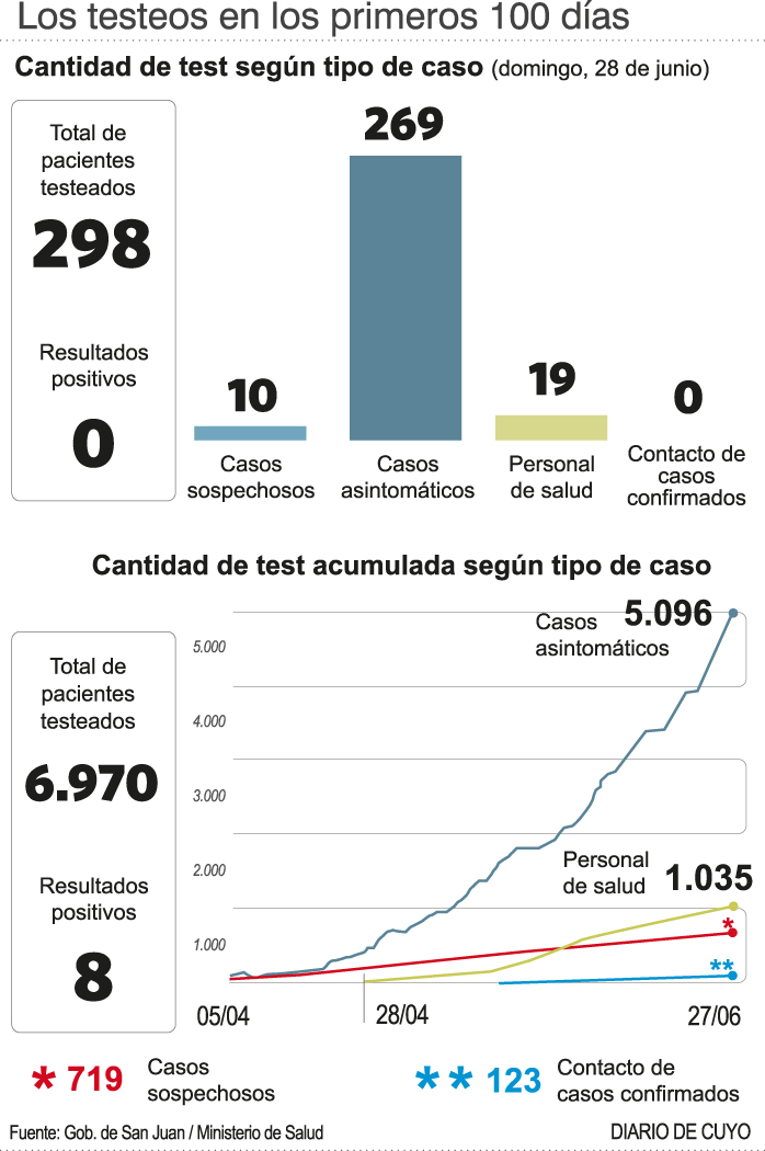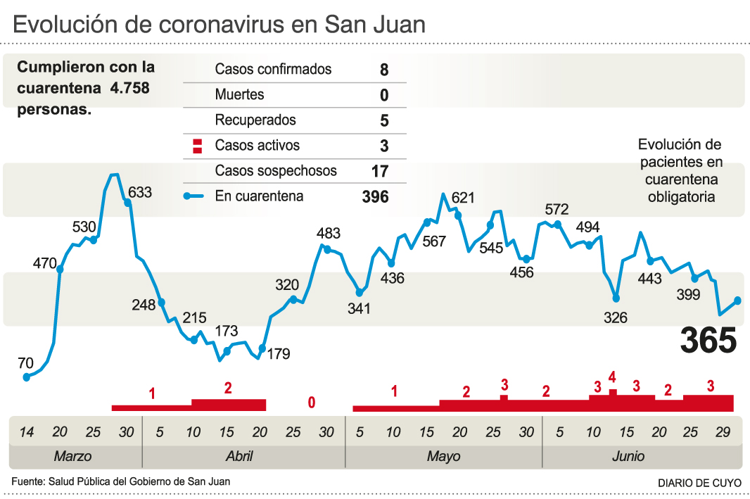 El parte diario emitido ayer por el Ministerio de Salud Pública dio a conocer que San Juan continúa sin nuevos casos, es que la PCR realizada al transportista mendocino que había dado positivo al test rápido el sábado, ayer dio como resultado negativo. El hombre oriundo de Luján de Cuyo se había sometido al control rápido en el Control de San Carlos y fue aislado en el Hospital de Media Agua, ya el domingo había quedado descartado el transportista sanjuanino que también había dado positivo el sábado en el testeo rápido. Ayer se realizaron además 160 testeos, todos con resultado negativo y son 17 los casos sospechosos. Hay 365 personas realizando cuarentena y ya son 4.758 quienes ya cumplieron con el aislamiento obligatorio.