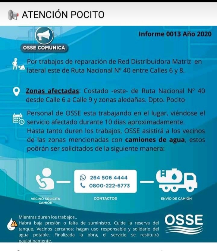 El agua es no sólo es un servicio sino que es un derecho humano. Desde hace 3 días, vecinos de Pocito lo ven coartado y la solución, de acuerdo a lo que expresan, es insuficiente. Además del tiempo que llevan, desde OSSE confirmaron que la situación se extenderá por 10 días más. Obras en Ruta 40, que abarcan el tramo desde calle 6 a 9, son la razón de la extensa interrupción.