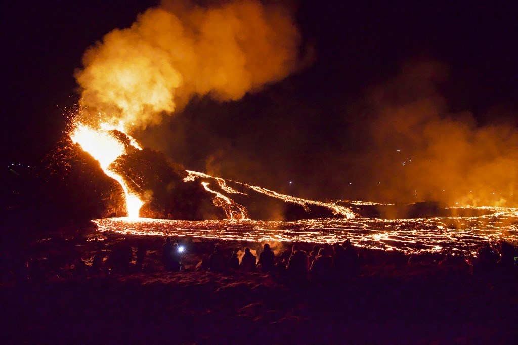 Pese a decretarse un perímetro de seguridad para proteger a los curiosos de los enormes fragmentos de roca caliente que se precipitan, aún son numerosos los que caminan hasta cerca del volcán, en el valle de Geldingadalir, cerca del monte Fagradalsfjall, a 40 kilómetros de Reikiavik.