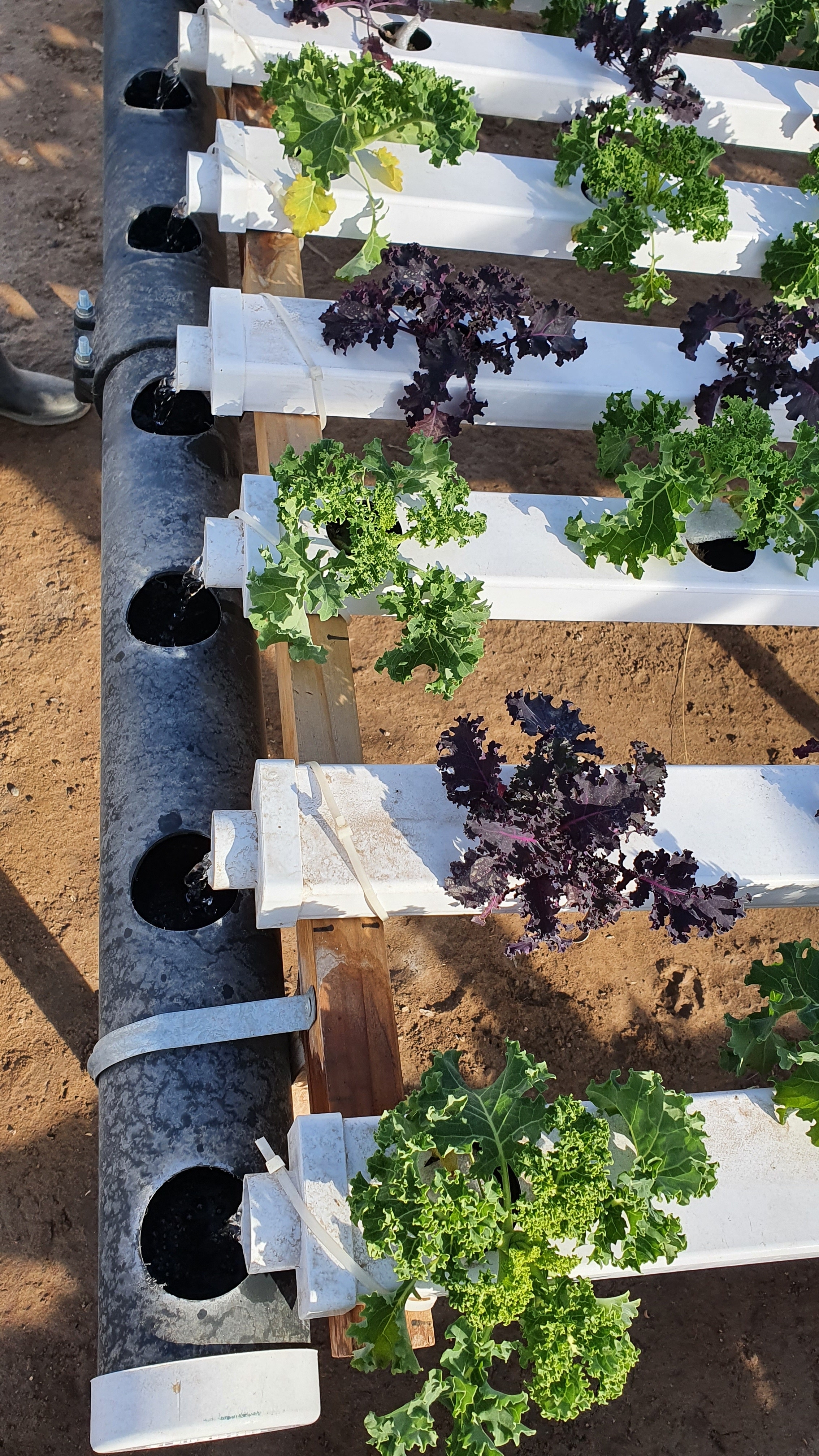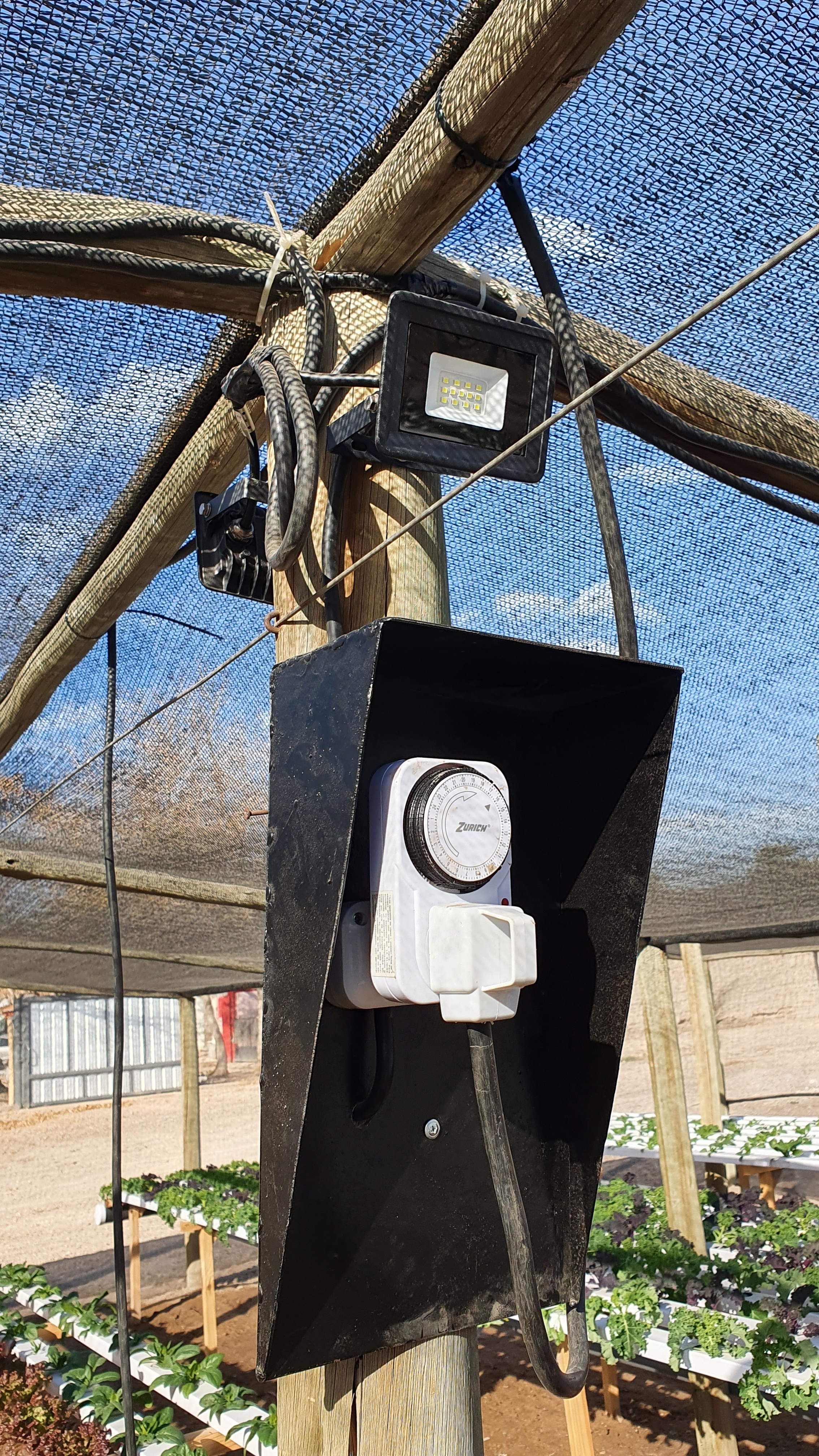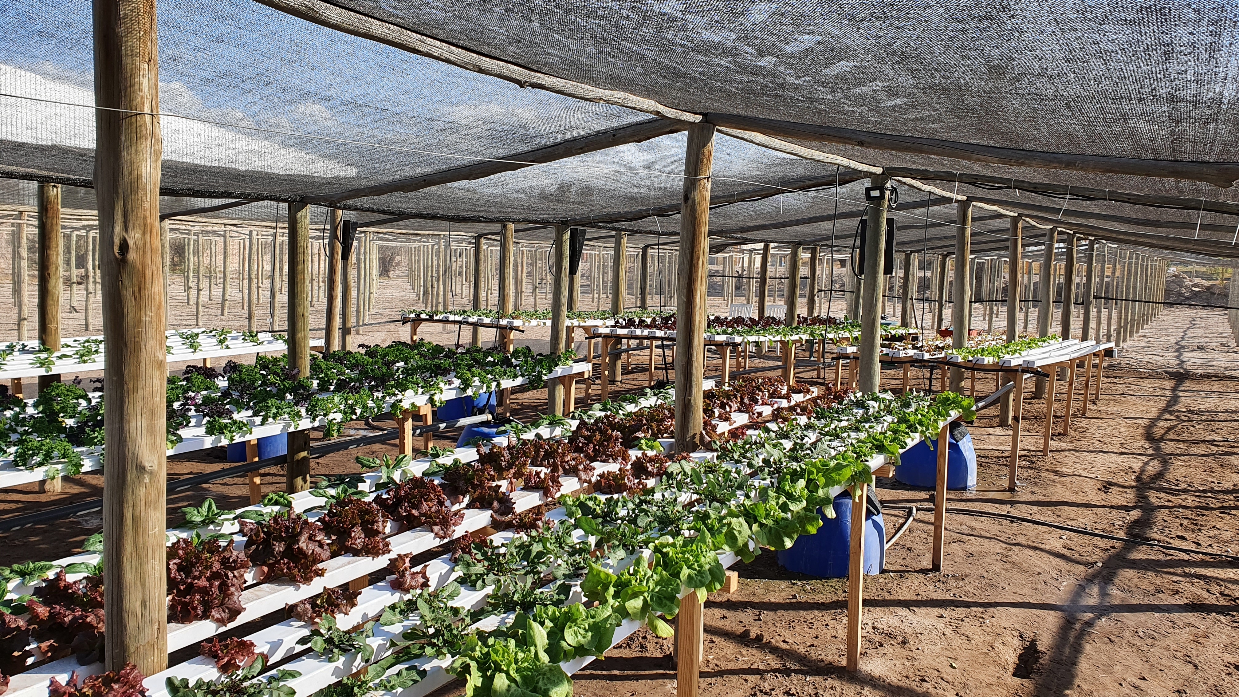 El sistema hídrico lo integran 6 tachos de plástico de 200 litros cada uno, que suman 1.200 litros de líquido elemento, vital para esta actividad. Se enciende el equipo, circula el agua por los "canales" de cultivo, que son las líneas de pvc blanco, con un caudal de 2 litros por hora, drena a continuación, vuelca el sobrante y este, por la parte inferior de estas camadas, vuelve al origen. Va en pendiente, cae por gravedad. Se recicla, se recircula. Todos los insumos se consiguen en Argentina, al principio los canales de cultivos provenían de Brasil, pero ya existe una fábrica nacional. Mangueras, codos, salidas, tanques, mallas, timer, bombas, etc., son locales. El techado y los costados, llevan malla media sombra agrícola, tradicional, sin ningún agregado.