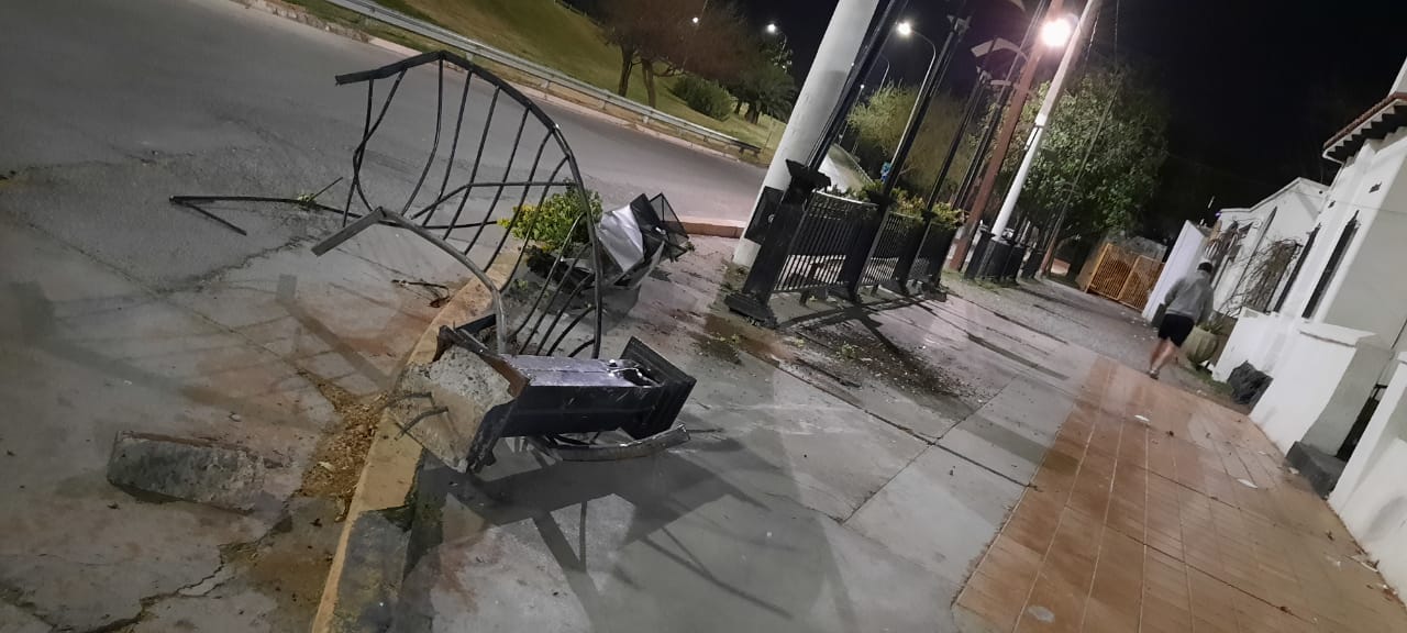 En las imágenes se puede ver claramente como el vehículo arruga las rejas y derriba una farola que se desploma contra la vereda. Pasan unos segundos, el conductor hace marcha atrás y sigue su camino.