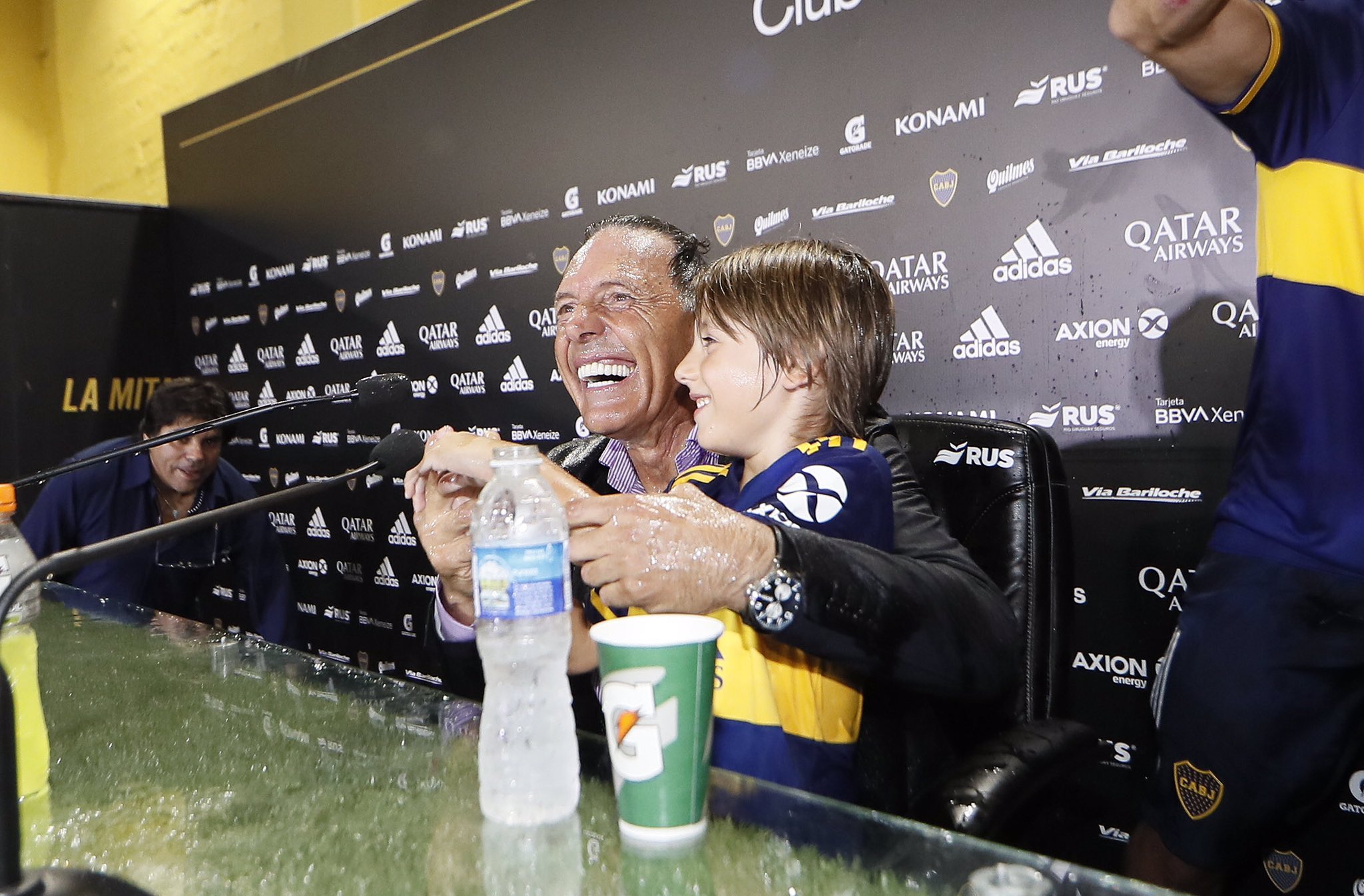 Si bien el encuentro con los micrófonos en el salón especial de la Bombonera es un capítulo obligado para el director técnico, esta conferencia de prensa no fue una más. Russo acudió al estrado junto con su nieto, como sucedió cuando ganó el Torneo Finalización 2017 con Millonarios de Colombia. El nene tenía puesta la camiseta xeneize. Russo, de camisa y saco, nunca abandonó su sonrisa radiante.