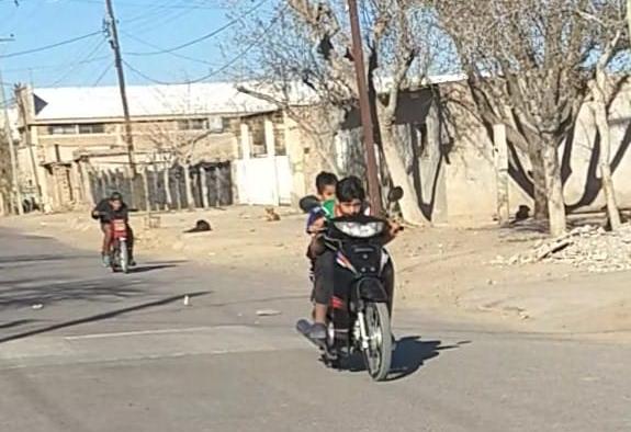 En las imágenes se observa a dos niños a bordo de la moto a alta velocidad, circulando por el medio de la calle. Quien conduce va agachado, tratando de avanzar lo más rápido posible.