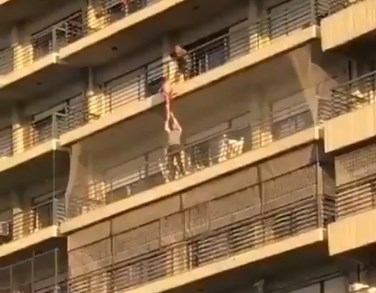 En la secuencia, dos personas intentan empujarlo de nuevo adentro, mientras desde el séptimo piso otra le sostiene las piernas y evita que se caiga al vacío. Luego, se ve a un cuarto hombre saltar barandas para llegar hasta el nene y agarrarlo.