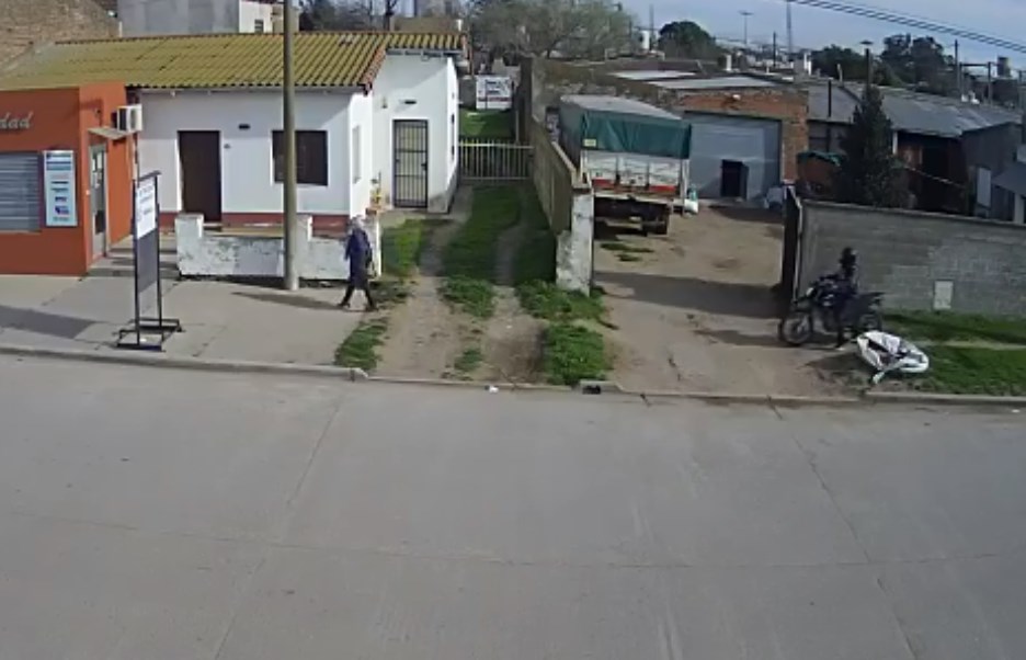 En ese momento, y tal como se aprecia en forma clara en un video captado por una cámara de seguridad, un sujeto a bordo de una moto de alta cilindrada, sube a la vereda, "estudia" los movimientos de su víctima, a la que tironea de su cartera con fines de robo.