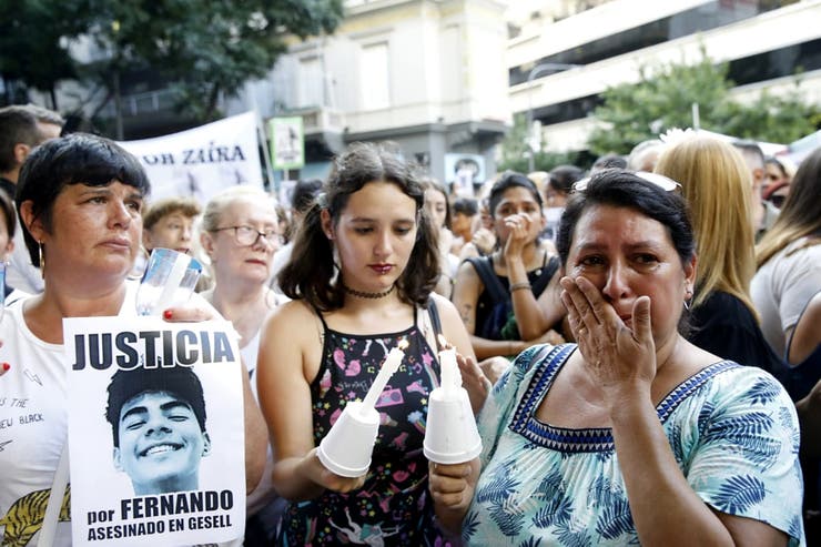 Antes de que la familia saliera, se rezó el "Padre Nuestro" y gritaron por justicia: "Asesinos presos" y "Perpetua", fueron dos de los pedidos que la movilización gritó antes de que la familia de Fernando salga del edificio. Otro cartel, con una pelota de fútbol americano y una lata de cerveza dibujadas, sintetizó el sentimiento de la multitud: "Basta de muertes. Justicia por Fernando".