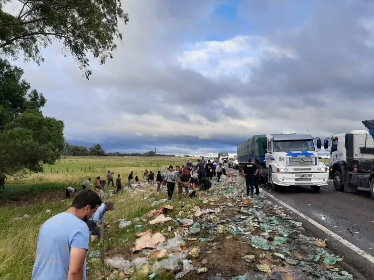 Un grupo de personas se congregó en la Ruta Provincial 65, a unos 10 kilómetros de Bolívar, para llevarse la carga de cervezas que perdió un camionero en una desafortunada maniobra.