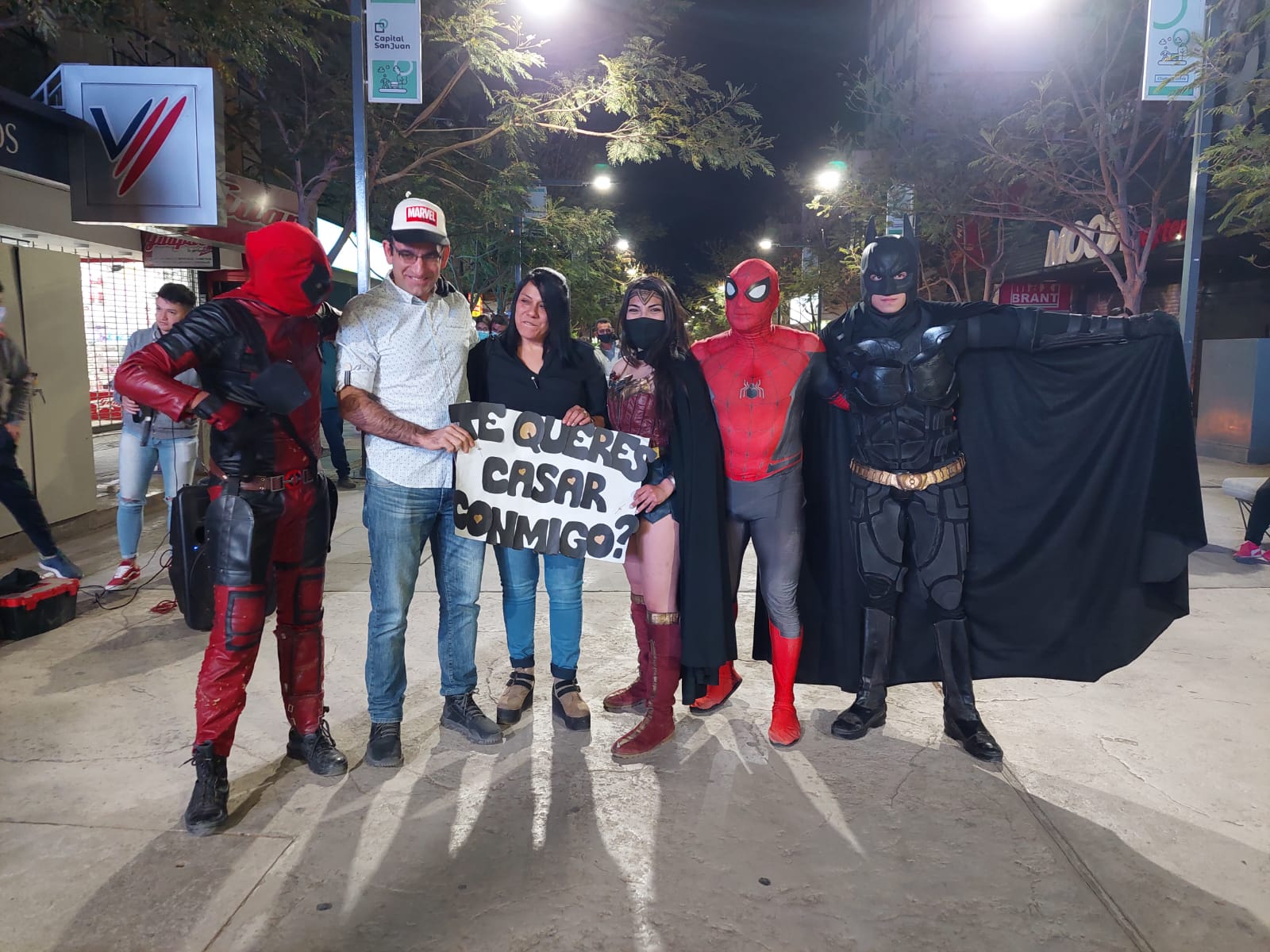 Sin poder contener la emoción por la enorme sonrisa que se le dibujó en su rostro, Lily, como la conocen cariñosamente, le propuso casamiento a su novio Marcos en plena peatonal sanjuanina pero con la complicidad de los populares superhéroes de cómics.