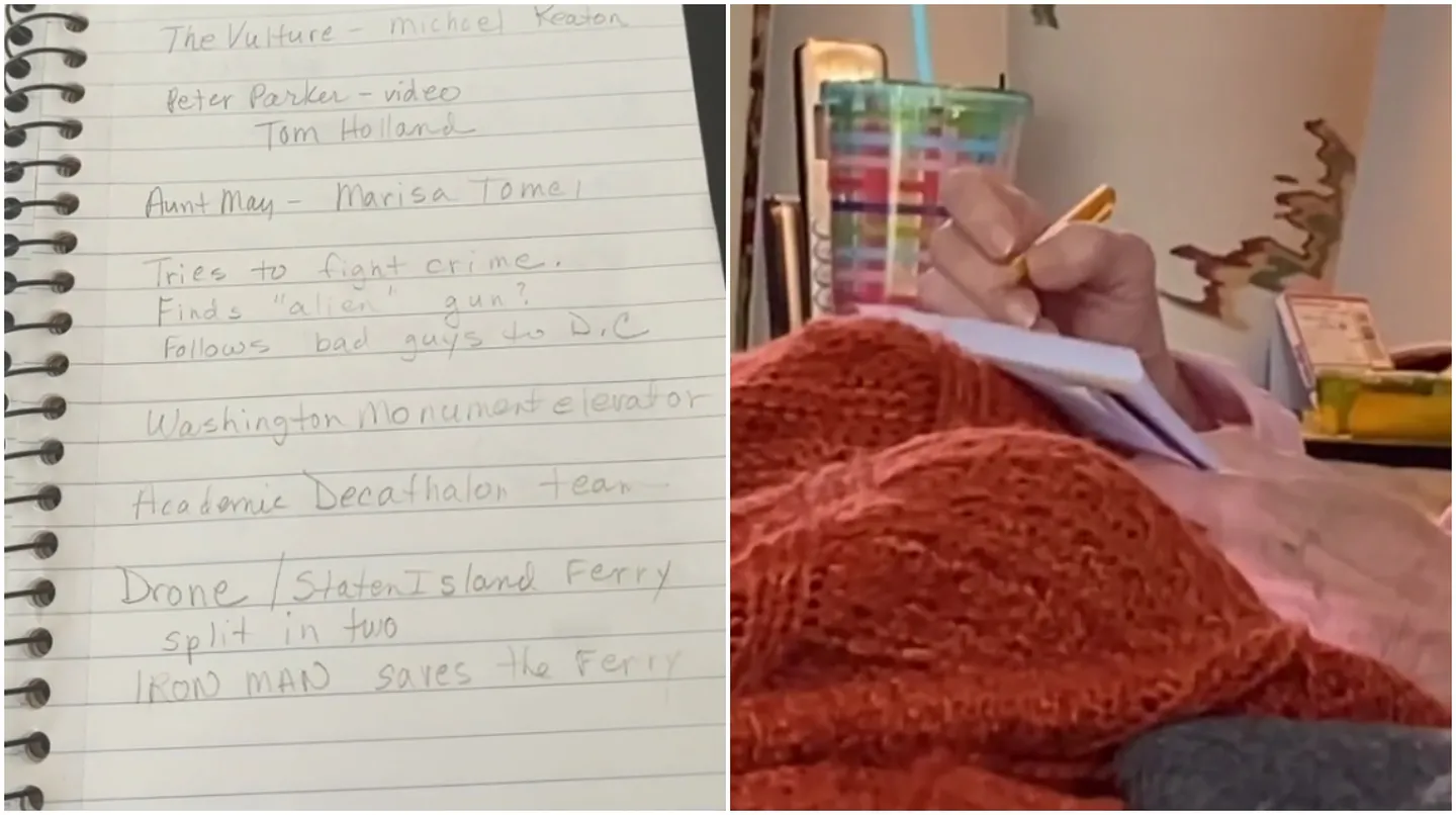 Cheryl Skiados es de Estados Unidos y tiene 70 años. El amor que siente por sus 13 nietos la impulsó a hacer esta maratón. Jackson King, de 18 años, aprovechó la oportunidad de filmar a su abuela cuando veía Spider-Man: Homecoming con una libreta y lapicera en mano.